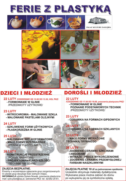 Zapraszamy na ferie z plastyką. Od 22 do 26 lutego (drugi tydzień ferii) dzieci, młodzież i dorośli będą mogli poznawać i rozwijać swoje umiejętności twórcze, doskonale się przy tym bawiąc. Przygotowaliśmy m.in. zajęcia ceramiczne, malarskie, rzeźbiarskie, witrażowe.