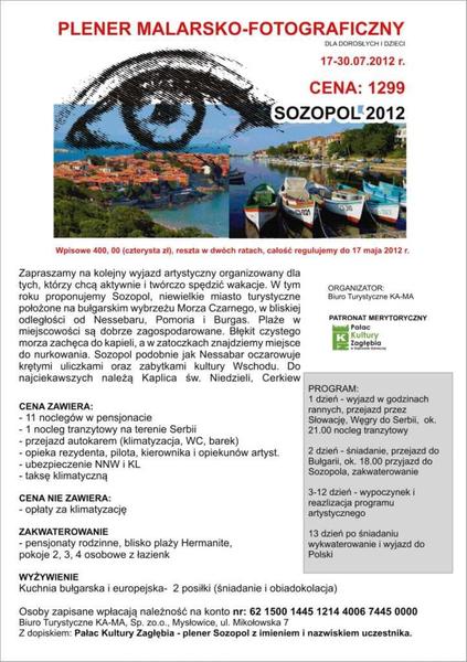 Zapraszamy na kolejny wyjazd artystyczny organizowany dla tych, którzy chcą aktywnie i twórczo spędzić wakacje. W tym roku proponujemy Sozopol, niewielkie miasto turystyczne położone na bułgarskim wybrzeżu Morza Czarnego, w bliskiej odległości od Nessebaru, Pomoria i Burgas. Plaże w miejscowości są dobrze zagospodarowane. Błękit czystego morza zachęca do kąpieli, a w zatoczkach znajdziemy miejsce do nurkowania. Sozopol podobnie jak Nessabar oczarowuje krętymi uliczkami oraz zabytkami kultury Wschodu. Do najciekawszych należą Kaplica św. Niedzieli, Cerkiew.