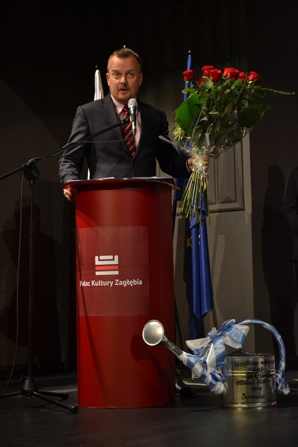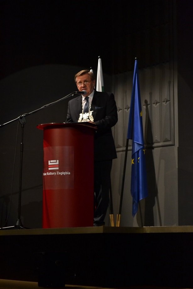 Po przywitaniu wszystkich przybyłych osób przez Przewodniczącą Rady Miejskiej – Agnieszkę Pasternak – przyszła pora na oficjalną ceremonię. Gdy tylko pojawił się sztandar miasta, Miejska Orkiestra Dęta odegrała hejnał Dąbrowy. Tuż po nim na scenę wyszedł gospodarz, czyli Prezydent Zbigniew Podraza, który nie tylko zabrał głos, nawiązując do obchodów 100-lecia, ale i wręczył kwiaty 100-letniej mieszkance – Natalii Bilewicz. Niespodzianką ze strony województwa śląskiego było przyznanie Dąbrowie Górniczej złotej odznaki honorowej za zasługi, którą przekazał Kazimierz Karolczak, a którą następnie oficjalnie przypięto do sztandaru. Nie obeszło się również bez życzeń urodzinowych i podziękowań od zaproszonych gości honorowych oraz wręczenia pamiątkowego aktu nadania praw miejskich byłym prezydentom miasta, z rąk obecnego włodarza - Zbigniewa Podrazy.