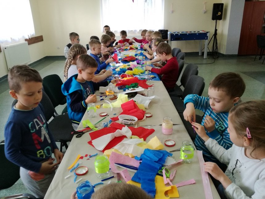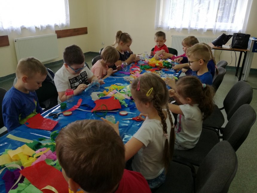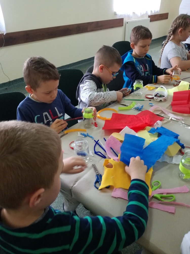 Podczas warsztatów manualnych z okazji Dnia Florysty w Świetlicy Środowiskowej w Łęce szklane słoiki przeszły prawdziwą metamorfozę. Dzięki twórczym zdolnościom dzieci zmieniły się w piękne kolorowe wazoniki, w których zagościły niepowtarzalne kwiatuszki z bibuły. Zabawa była przednia.