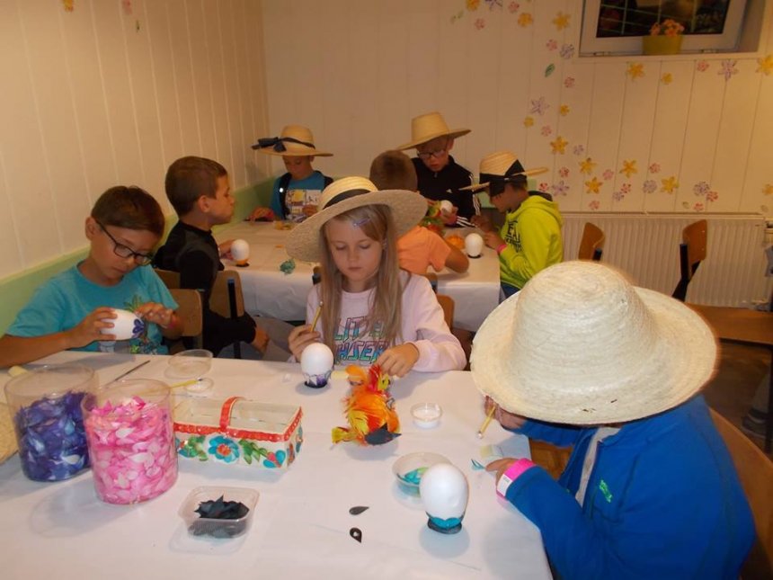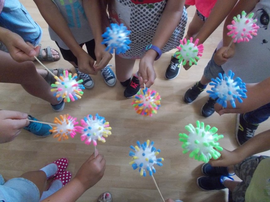 Świetlica w Łośniu także zaproponowała wiele rozrywki, w tym kręgielnię, zwiedzanie PKZ czy zajęcia w Centrum Formy. Obowiązkowo odbyły się warsztaty plastyczne i manualne - kwiatki z łyżeczek plastikowych, pompon na widelcu, wzory z koralików PYSSLA, breloczki, zabawa z masą solną. Było malowanie i ozdabianie szklanych lampionów, kolorowe kwiatki dmuchawca na kulce styropianowej patyczkami kosmetycznymi. Na zakończenie powstało wspólne drzewo z odbitkami dłoni uczestników.