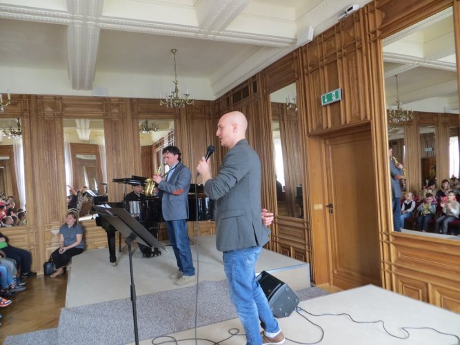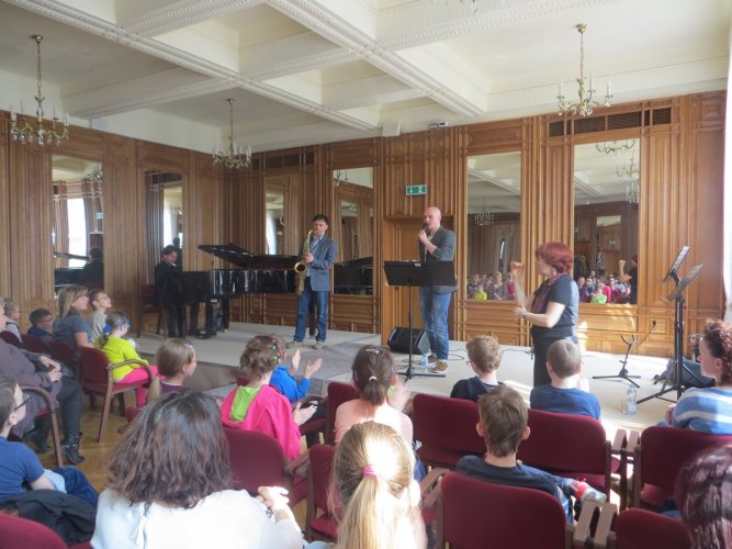 Podczas dzisiejszego spotkania uczniowie mieli okazję posłuchać utworów z gatunku Gospel. Oprócz samej muzyki poznali bliżej budowę i działanie saksofonu i saksofonu sopranowego. Największą frajdą dla młodych słuchaczy było wspólne śpiewanie i klaskanie do piosenki „Hallelujah” – znanej również z filmu „Shrek”.