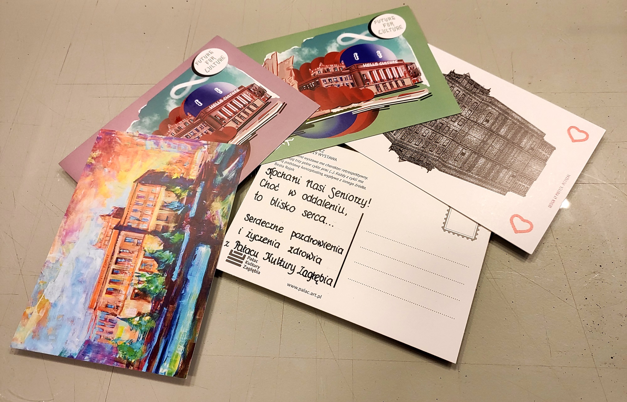 Pandemia doskwiera nam wszystkim, ale seniorom w szczególności – osobiste odwiedziny u podopiecznych Domów Opieki Społecznej stały się obecnie niemożliwe. Pracownicy Pałacu Kultury Zagłębia postanowili sprawić małą niespodziankę dąbrowskim seniorom i przesłać serdeczności i wyrazy ciepła dla seniorów za pośrednictwem tradycyjnych kart pocztowych z życzeniami. Karty z wizerunkami pałacu pochodzą z kolekcji wykonanej przez artystów, których wystawy prezentowane były w ostatnich latach w Galerii Sztuki PKZ.