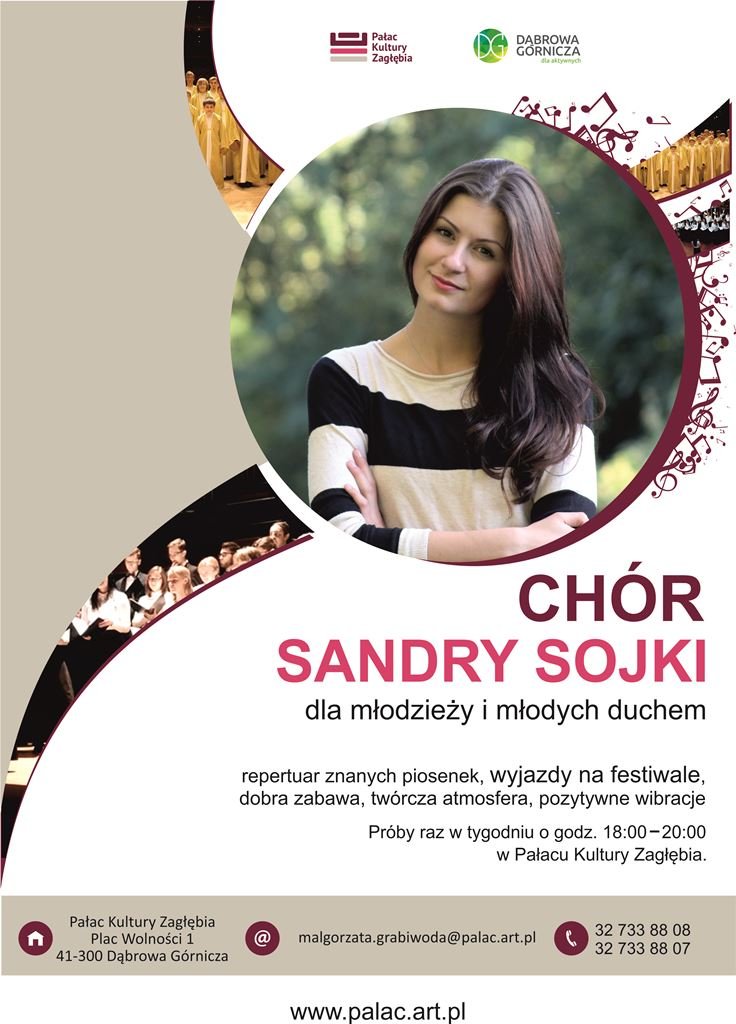 Dział Edukacji Artystycznej Pałacu Kultury Zagłębia zaprasza na zajęcia Chóru Sandry Sojki, które skierowane są do młodzieży i osób młodych duchem. Zajęcia poprowadzi piękna i przesympatyczna studentka 4. roku studiów dyrygentury chóralnej oraz pianistka Sandra Sojka. Podczas spotkań chóru uczestnicy śpiewać będą wszystkim dobrze znane piosenki, ale przede wszystkim będą się dobrze bawić i zarażać pozytywną energią. Gwarantowana dobra zabawa oraz wyjazdy na festiwale chóralne.