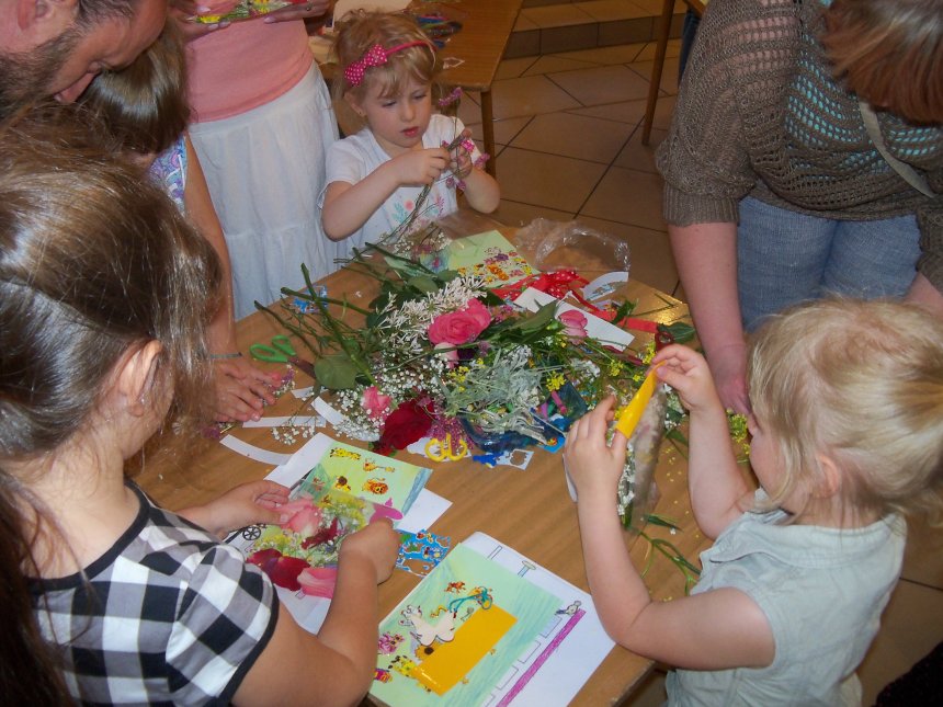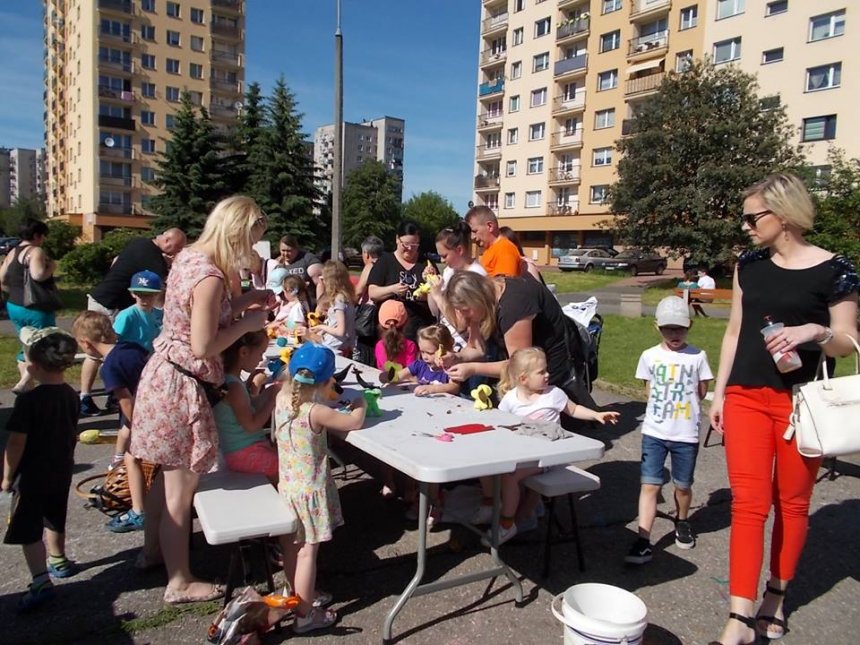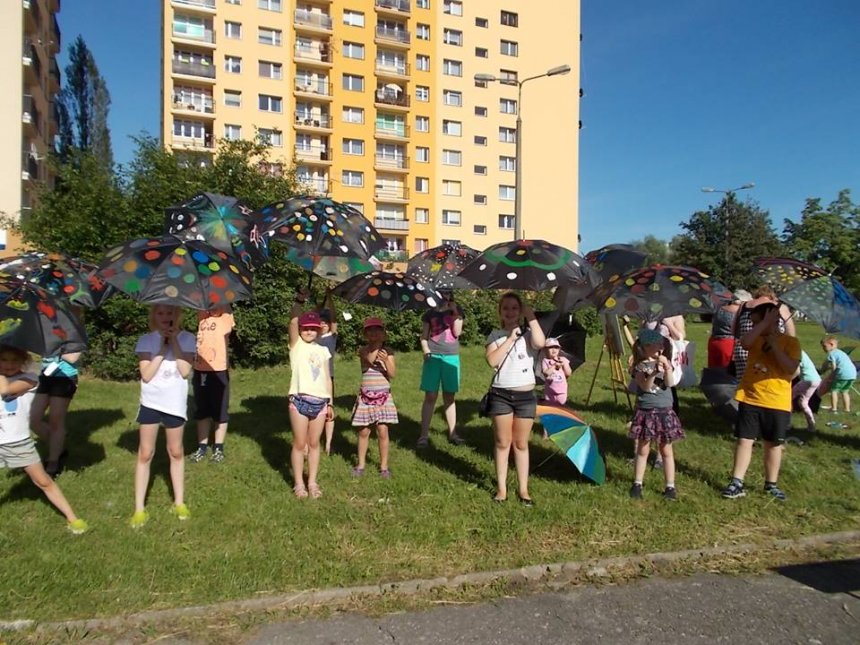 Dzień Dziecka świętowaliśmy w plenerze, na placu przed klubem. Dzieciaki uczestniczące w warsztatach plastycznych, w rytm piosenki (….) czarne przegrywa kolor wygrywa!, przy użyciu wyobraźni pomalowały ciemne parasole, nadając im nowego, kolorowego oblicza. Dla chętnych – można było również ulepić coś z gliny, przyozdobić talerz czy stworzyć indywidualną maskotkę z kolorowej, frotowej ściereczki. Pogoda dopisała, humory też!