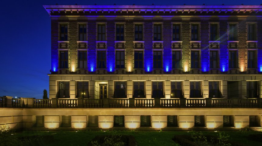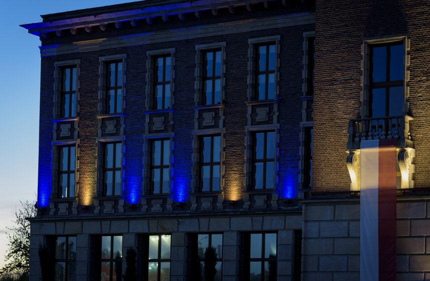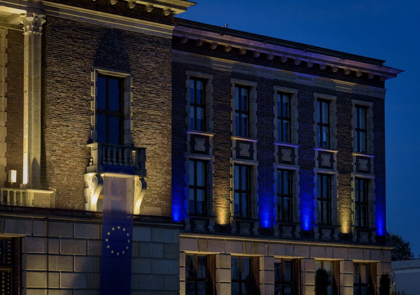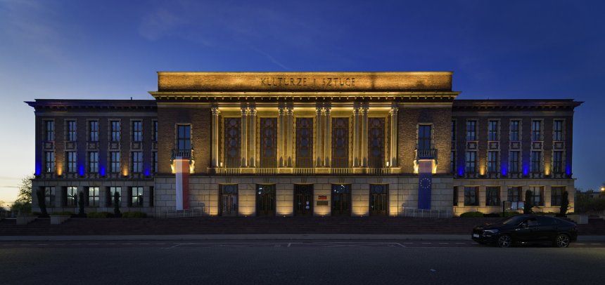 W niedzielę tj. 9 maja - 8 dni po rocznicy przyjęcia Polski do Unii Europejskiej - świętowaliśmy Dzień Europy. Z tej okazji Pałac Kultury Zagłębia zaświecił się w kolorach flagi Unii Europejskiej. Dodatkowo w południe i po zmroku z pałacowych głośników rozbrzmiała Oda do radości, czyli hymn europejskiej wspólnoty narodów.