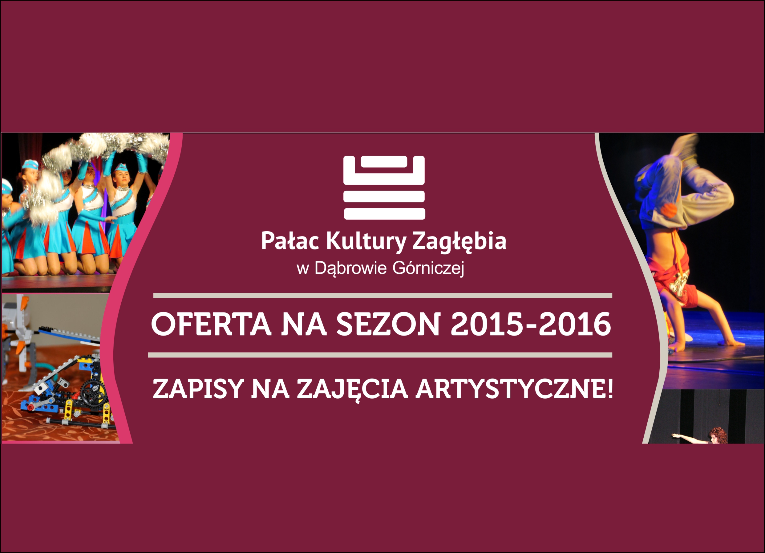 Koniec wakacji wcale nie musi oznaczać nudy i nastania smutnej jesieni! Pałac Kultury Zagłębia zaprasza do zapoznania się z bogatą ofertą regularnych zajęć na sezon 2015/2016, w której z pewnością każdy znajdzie dla siebie coś interesującego. Mamy nadzieję, że nasz potencjał - kreatywni instruktorzy, życzliwi pracownicy oraz wieloletnie doświadczenie, pozwolą na stworzenie niepowtarzalnego klimatu spotkań ze sztuką w nadchodzącym sezonie.