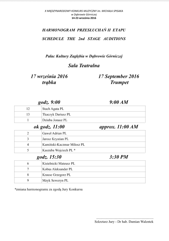 Harmonogram II etapu - trąbka (Schedule of the 2nd stage auditions - trumpet) UPDATE!