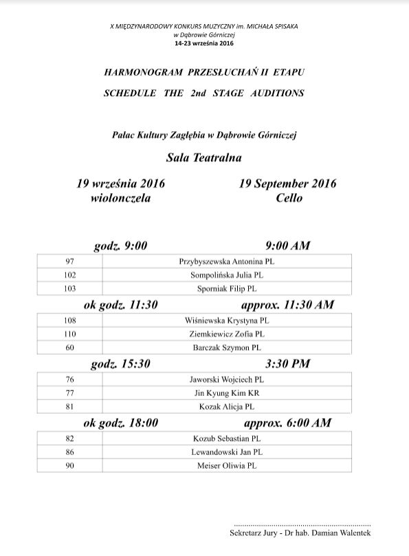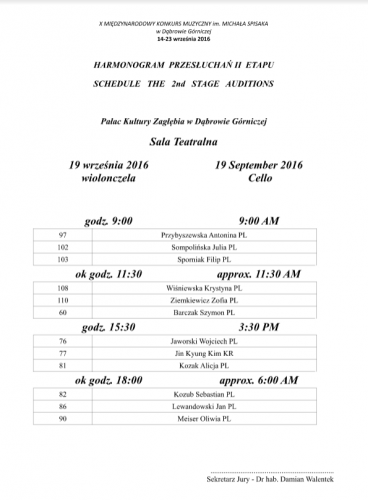 Harmonogram II etapu - wiolonczela (schedule of the 2nd stage auditions - cello) 16.09.2016 Aktualności Autor: Olaf Otwinowski Harmonogram poniżej: Below You can find the schedule: Głosuj na to zdjęcie65PoprzednieNastępne Tagi: harmonogram, II etap, wiolonczela, X Międzynarodowy Konkurs Muzyczny im. Michała Spisaka Podziel się:Udostępnij na Facebooku