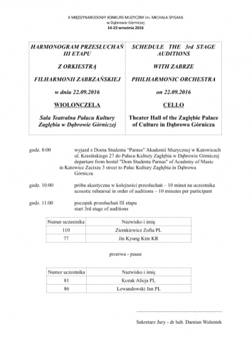 Harmonogram III etap - wiolonczela (The schedule of the 3rd stage auditions - cello) 20.09.2016 Aktualności Autor: Olaf Otwinowski Harmonogram poniżej: Below You can find the schedule: Głosuj na to zdjęcie50PoprzednieNastępne Tagi: harmonogram, wiolonczela, cello, X Międzynarodowy Konkurs Muzyczny im. Michała Spisaka, aktualności Podziel się:Udostępnij na Facebooku