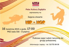 Zapraszamy wszystkich zainteresowanych, na otwarte zajęcia HIP–HOP, w trakcie których przeprowadzimy nabór tancerzy do grupy pokazowej.