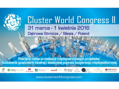 W dniu 1 kwietnia 2016 roku, w Dąbrowie Górniczej odbędzie się II Światowy Kongres Klastrów – Cluster World Congress, pod hasłem przewodnim “Potrójna helisa w realizacji międzynarodowych projektów. Budowanie gospodarki lokalnej i światowej poprzez kooperację międzysektorową”.