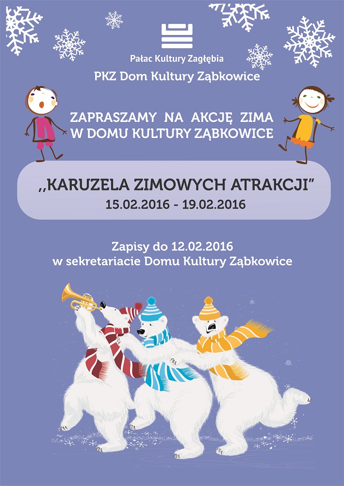 Dom Kultury Ząbkowice serdcznie zaprasza dzieci na tegoroczną Akcję Zima pod szalonym tytułem "Karuzela zimowych atrakcji".