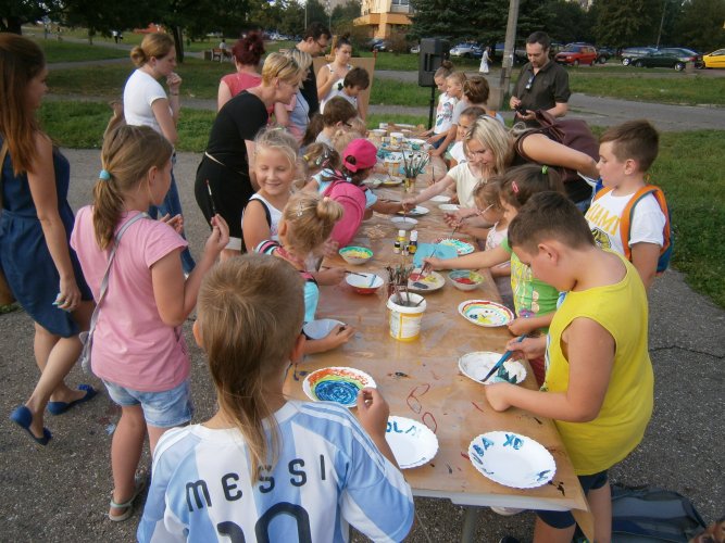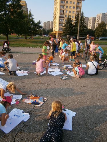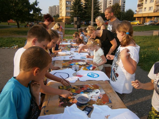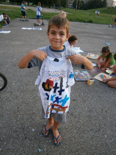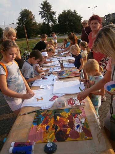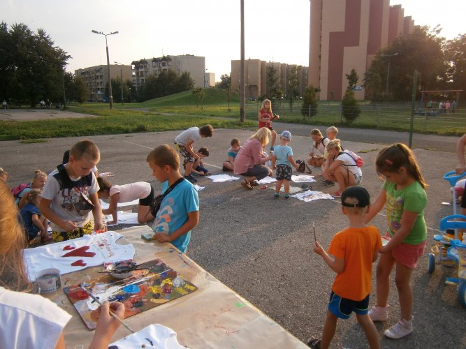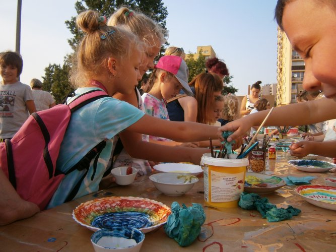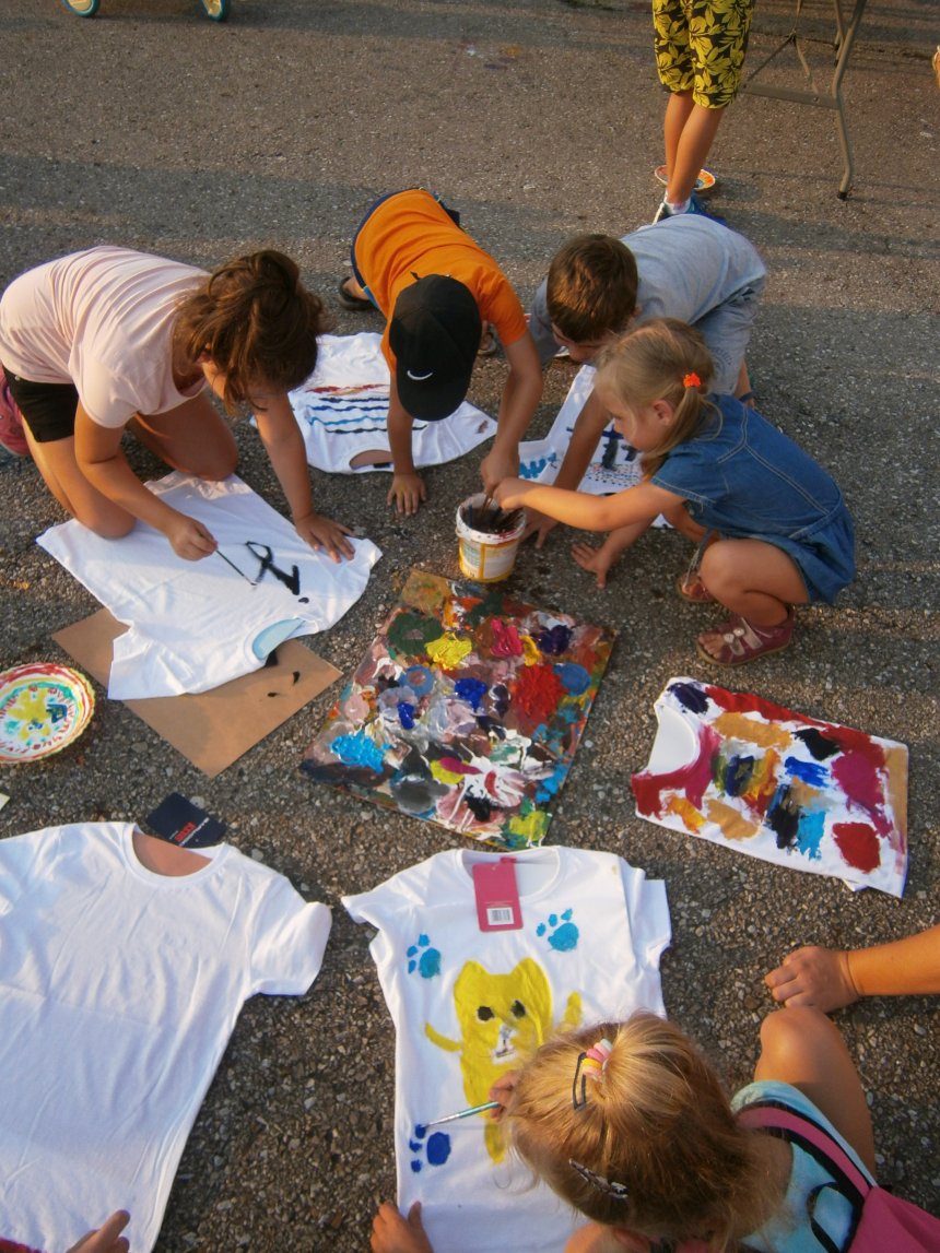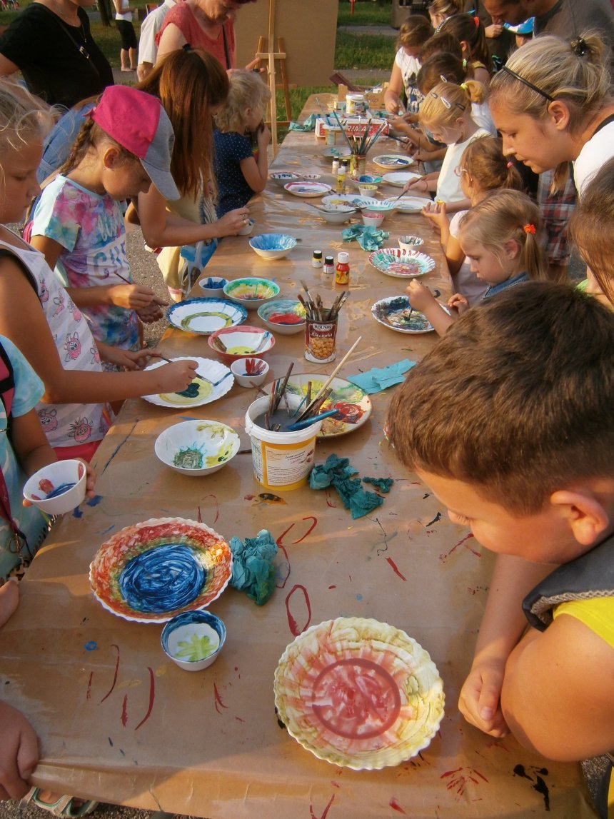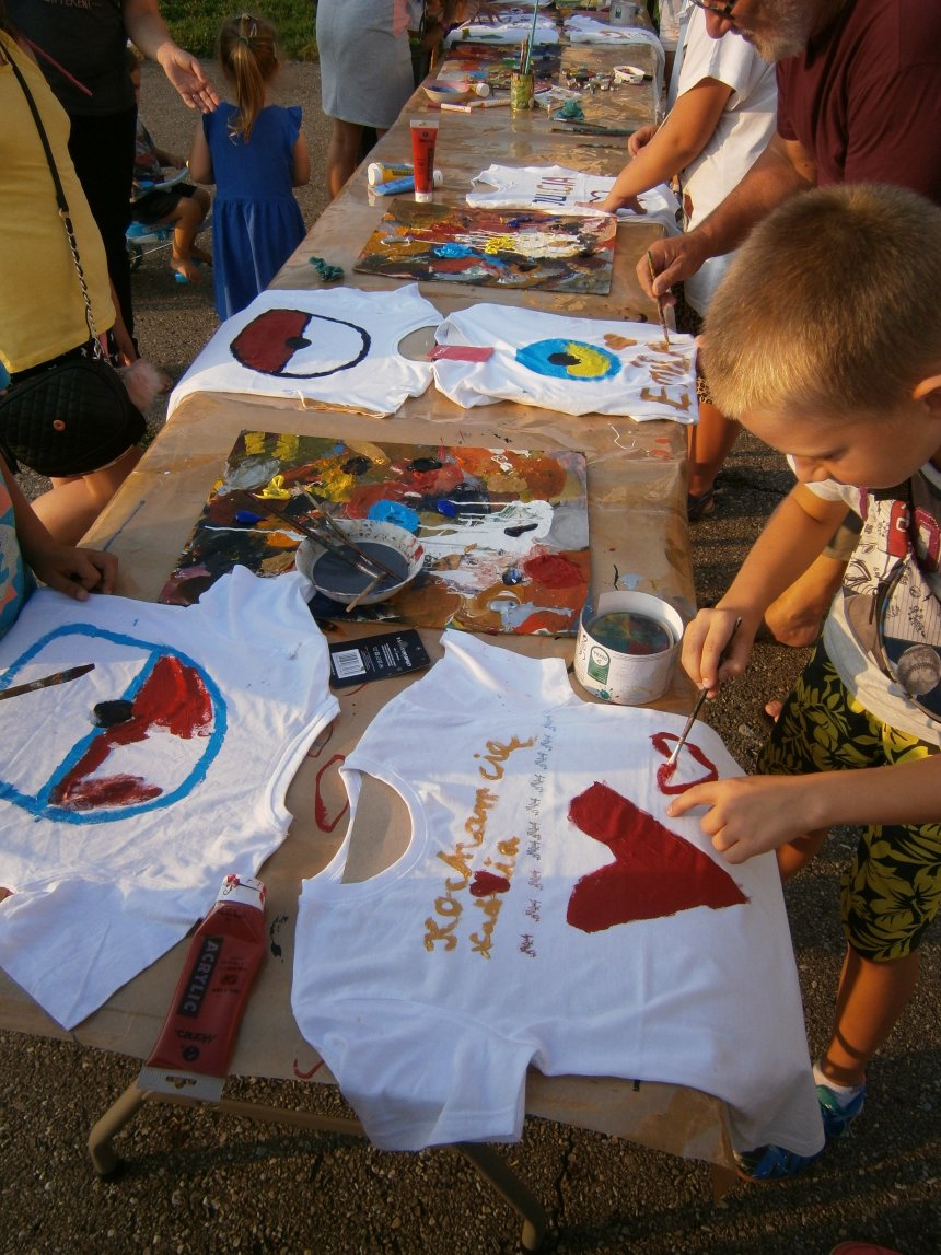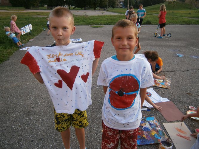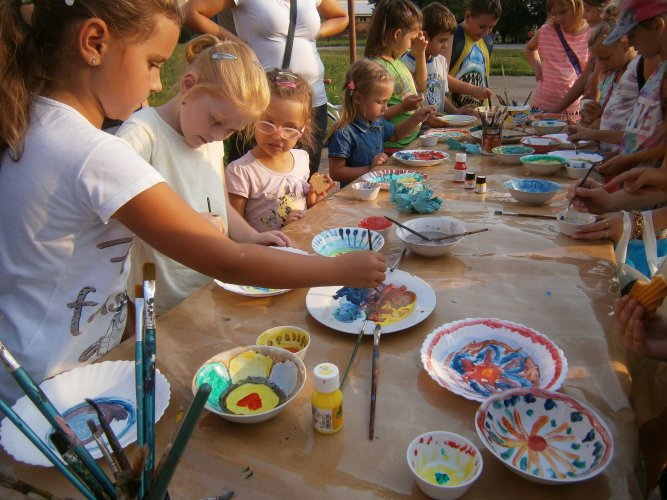 Było kilka już wielokrotnie sprawdzonych atrakcji dla najmłodszych. Przy muzyce dzieci malowały na porcelanie, kubkach, talerzach i miseczkach specjalnymi farbami, króre utrwala się wypiekając naczynie w piekarniku. Jak zawsze dużą popularnościa cieszyło się malowanie na koszulkach, oczywiście farbami do tkanin. Przeważała tematyka roślinno-kwiatowa, wzory geometryczne, chłopcy oczywiście malowali koszulki piłkarskie i postacie z gier komputerowych. Malowano też pejzaże, wypisywano imiona i nawet, jak można zobaczyć na zdjęciach wyznania miłosne.