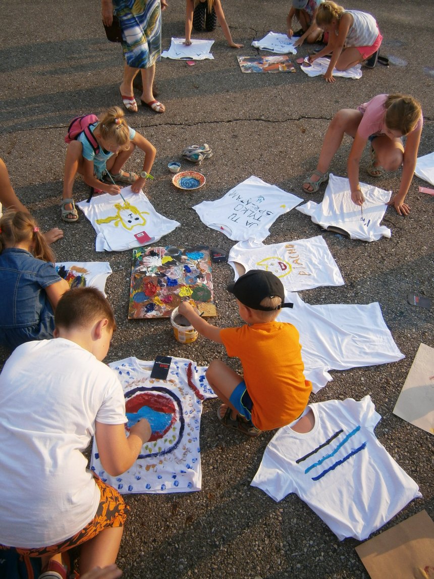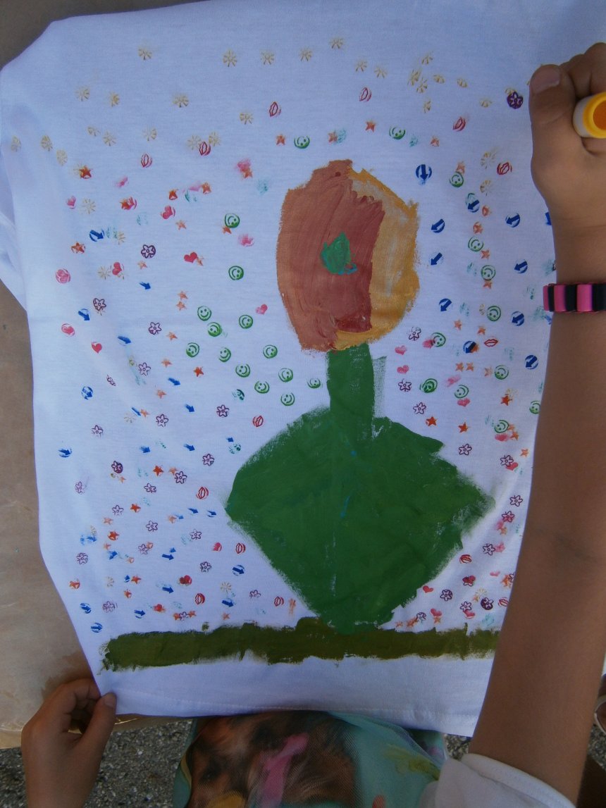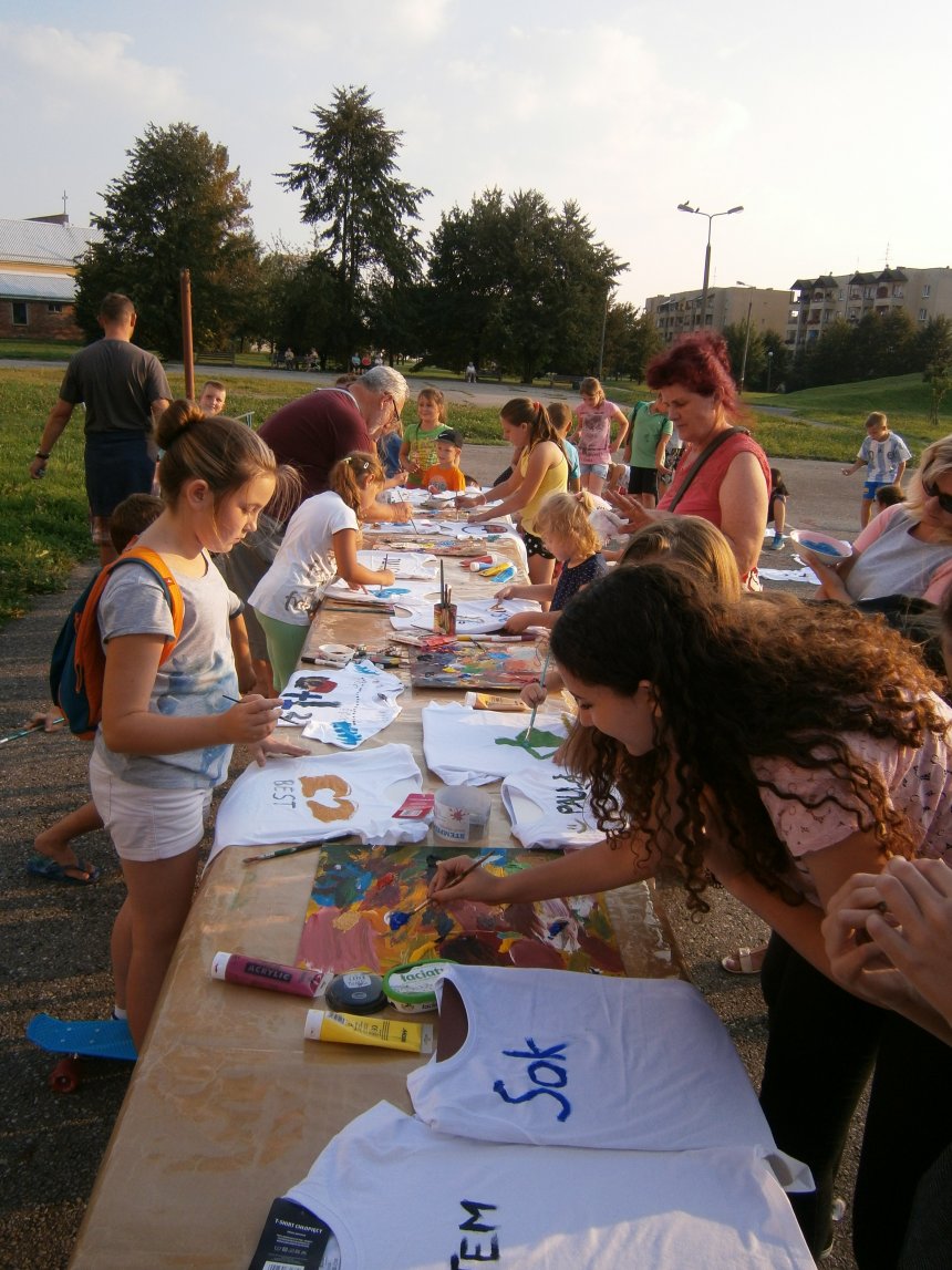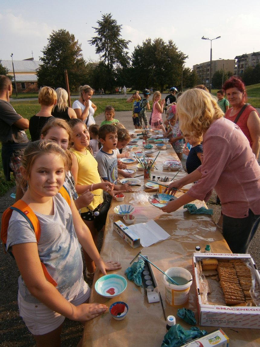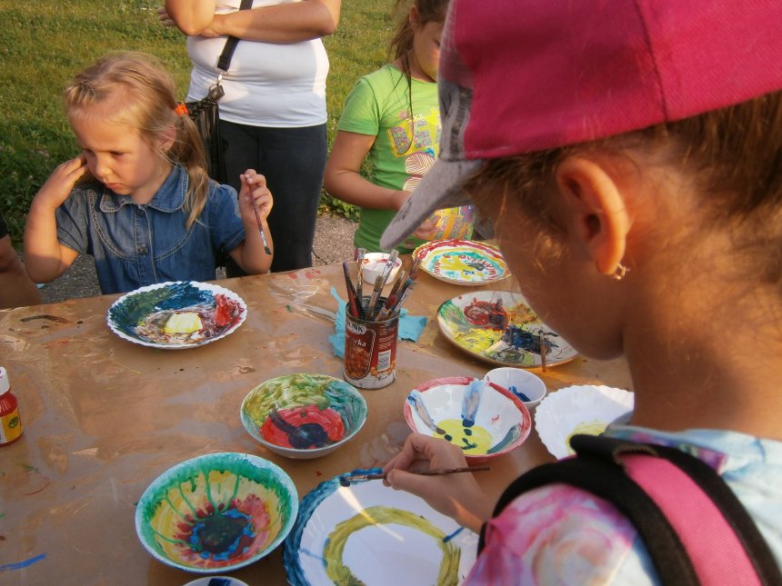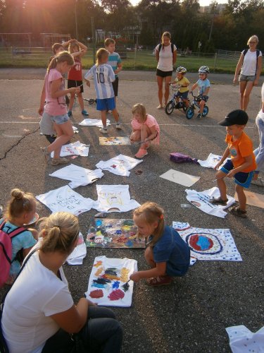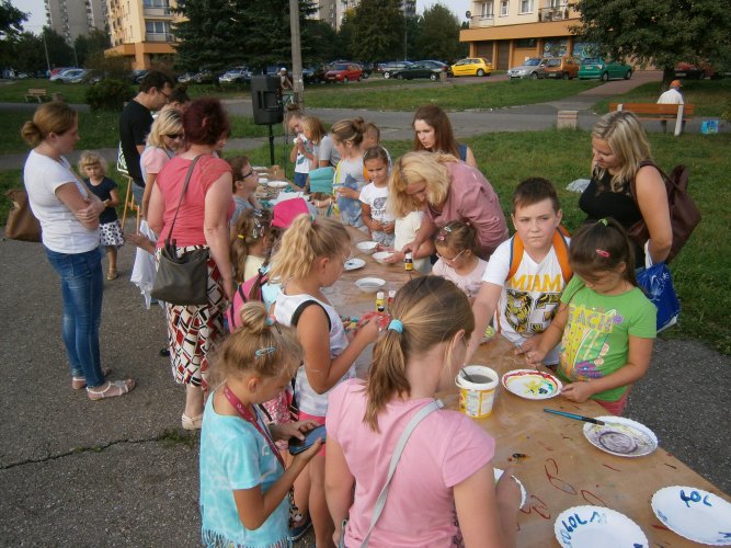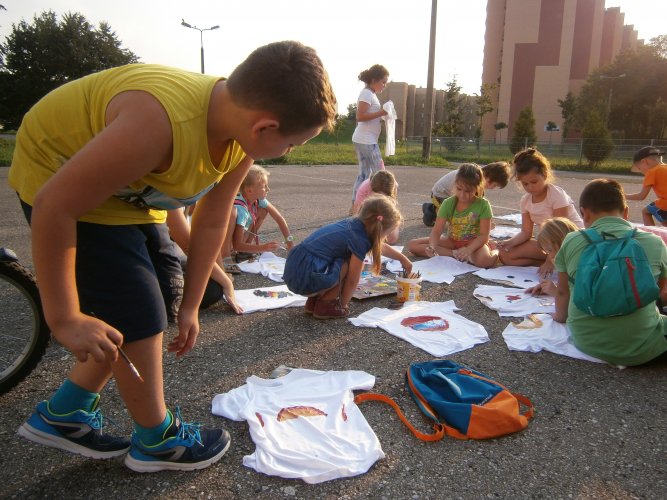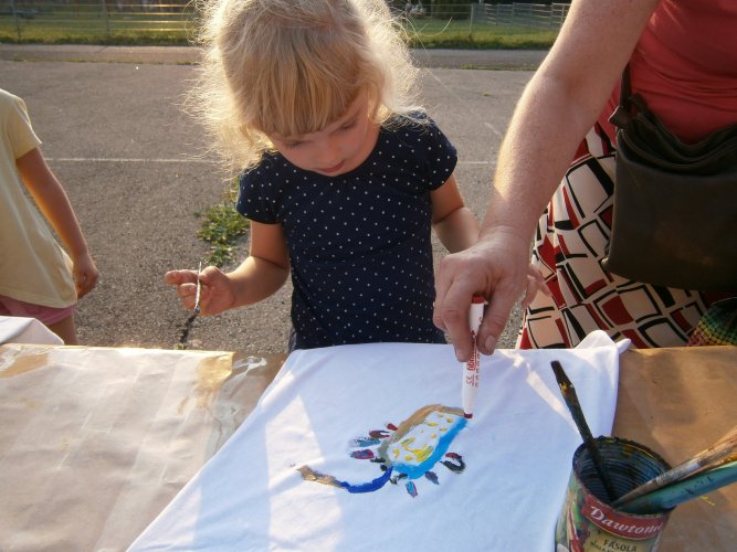 Było kilka już wielokrotnie sprawdzonych atrakcji dla najmłodszych. Przy muzyce dzieci malowały na porcelanie, kubkach, talerzach i miseczkach specjalnymi farbami, króre utrwala się wypiekając naczynie w piekarniku. Jak zawsze dużą popularnościa cieszyło się malowanie na koszulkach, oczywiście farbami do tkanin. Przeważała tematyka roślinno-kwiatowa, wzory geometryczne, chłopcy oczywiście malowali koszulki piłkarskie i postacie z gier komputerowych. Malowano też pejzaże, wypisywano imiona i nawet, jak można zobaczyć na zdjęciach wyznania miłosne.