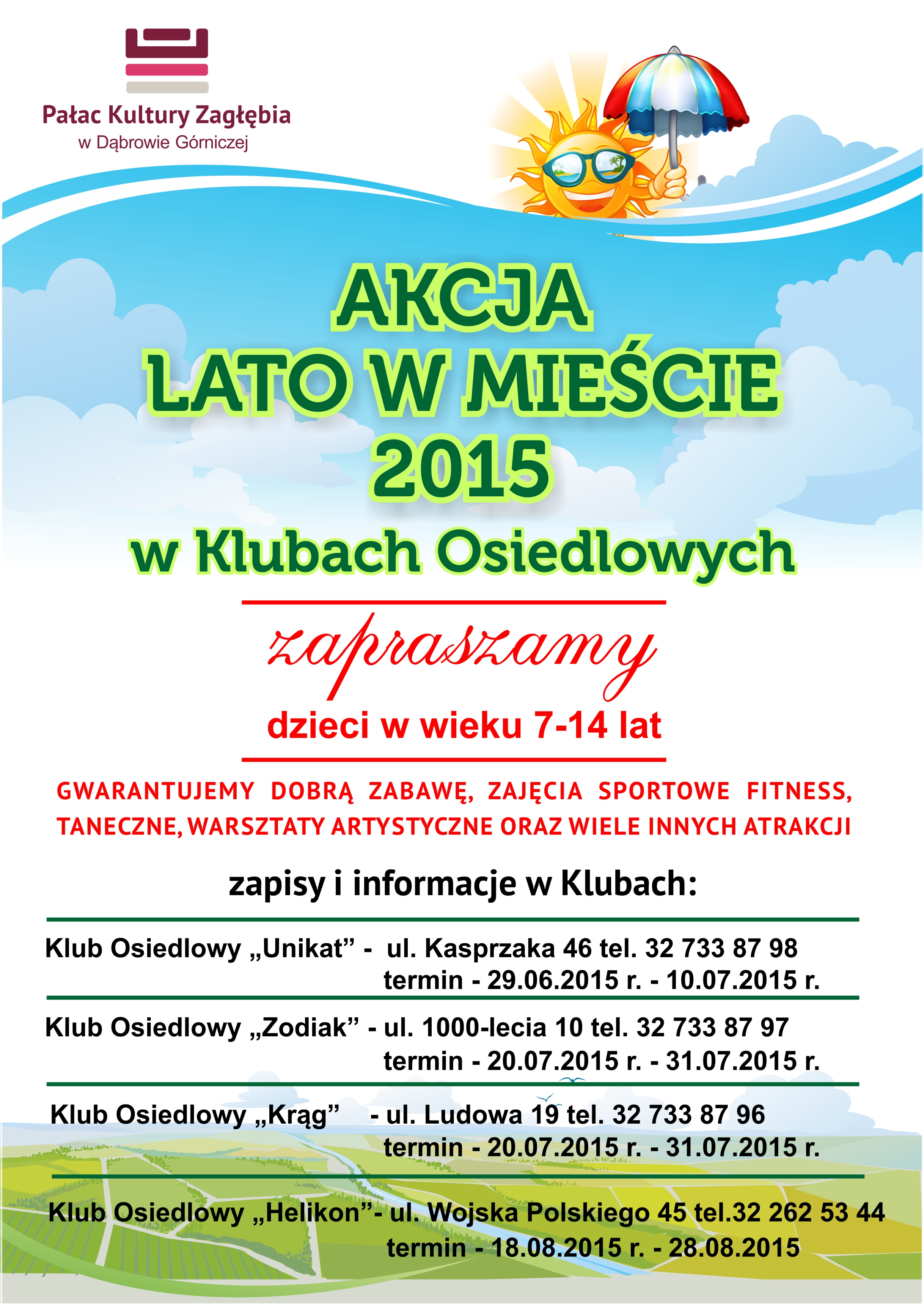 Serdecznie zapraszamy wszystkie dzieciaki pozostające w mieście w czasie wakacji, na Akcję Lato w Klubach Osiedlowych.