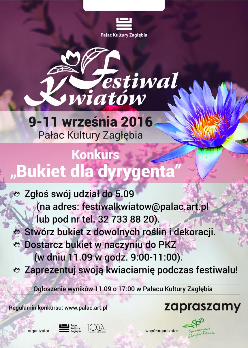 Konkurs "Bukiet dla dyrygenta" skierowany jest do pracowni florystycznych oraz kwiaciarni z okolic Dąbrowy Górniczej i organizowany w ramach Festiwalu Kwiatów. Wystarczy stworzyć bukiet z dowolnych roślin i dekoracji, który byłby idealny dla Krzysztofa Pendereckiego - dyrygenta X Międzynarodowego Konkursu Muzycznego im. Michała Spisaka. Jeśli chcesz zgłosić swoją pracownię, wyślij zgłoszenie na adres: festiwalkwiatow@palac.art.pl lub zadzwoń na numer: (32) 733 88 20 - masz czas do 5 września. Stworzony bukiet należy dostarczyć w naczyniu, 11 września do Pałacu Kultury Zagłębia, w godzinach od 9.00 - 11.00.