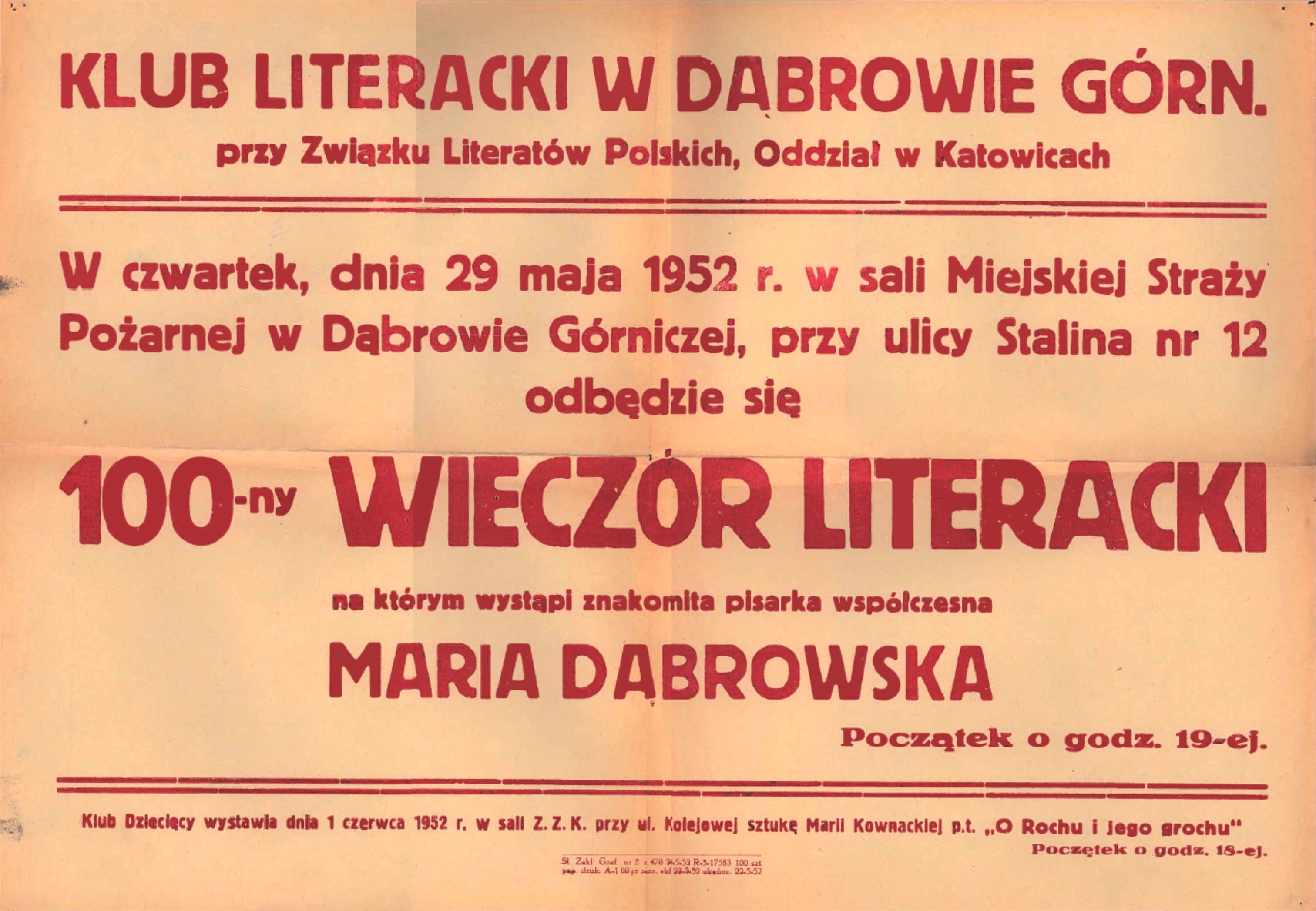 W naszych zbiorach archiwalnych, nad którymi pieczę sprawuje Joanna Jarzynka, można odnaleźć prawdziwe skarby. Jednym z nich, odszukanych przez naszą koleżankę jest kronika klubowa, zawierająca dedykacje, zdjęcia i autografy zaproszonych gości oraz kolekcja afiszów zapowiadających wieczory literackie, drukowanych tradycyjnie z użyciem czcionek afiszowych (dużych czcionek wykonanych z twardego drewna). Z bogatej kolekcji osobistości świata literackiego, które zagościły ciałem i duchem w Dąbrowie, wybraliśmy kilkanaście znakomitych postaci, których sylwetki przybliżymy Wam, mając na celu nie tylko przypomnienie rzadziej wspominanych – niekiedy już niesłusznie – polskich artystów, ale wierząc, że być może w domowych biblioteczkach czy kartonach na stryszku znajdziecie ich dzieła i zechcecie poświęcić im swój czas i uwagę, gdyż są to propozycje z wysokiej półki, przynoszące refleksję, dobrą rozrywkę i duchowy rozwój.