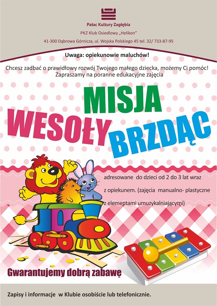 Zapraszamy dzieci wraz z rodzicami na poranne zajęcia "Misja wesoły brzdąc" do Klubu Osiedlowego Helikon. Będziemy się wspólnie bawić, malować, rysować, tańczyć, śpiewać, a przede wszystkim aktywnie i twórczo spędzać czas.