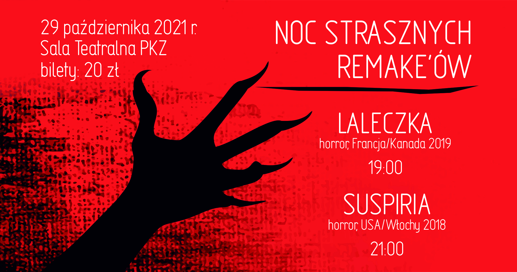 29 października zapraszamy wszystkich na wyjątkowo straszne wydarzenie. Będzie to mini maraton z remake'ami filmów grozy nawiązującymi do mistrzów tego gatunku: Toma Hollanda odpowiedzialnego za najbardziej przerażającą laleczkę na świecie (laleczka Chucky) oraz Dario Argento, włoskiego reżysera, prawdziwego geniusza giallo (Suspiria, Inferno, Głęboka czerwień).