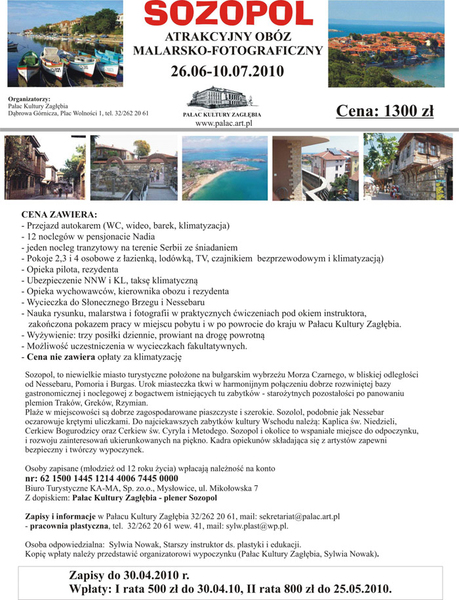 Po raz kolejny Pałac Kultury Zagłębia zaprasza młodzież do aktywnego wypoczynku wakacyjnego. W tym roku wypoczywać będziemy w miejscowości Sozopol w Bułgarii. Zapraszamy młodzież od 12. roku zainteresowaną malarstwem i fotografią do wakacyjnej przygody z pędzlem i obiektywem. Codzienne warsztaty artystyczne, kąpiel w morzu i wycieczki sprawią, że będzie to czas spędzony w wyjątkowy sposób. Opiekę nad grupą sprawować będą artyści plastycy. O przyjęciu na obóz decyduje zainteresowanie uczestnika sztuką. Ilość miejsc ograniczona. Osoba odpowiedzialna za organizację i wyjazd grupy Sylwia Nowak, pracownia plastyczna PKZ,