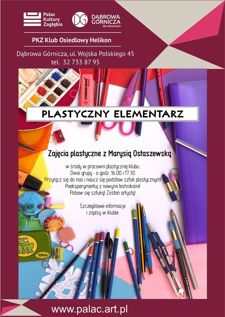 Wszystkich tych, którym nie udało zapisać się na zajęcia w Pracowni Plastycznej Sylwii Nowak, zapraszamy do wzięcia udziału w warsztatach Plastyczny Elementarz prowadzonych przez Marysię Ostaszewską. Zajęcia będą odbywać się w środy w pracowni plastycznej Klubu Osiedlowego Helikon w godzinach 16:00 i 17:30. Dzięki warsztatom będzie można poznać podstawy sztuk plastycznych, poekseprymentować nowymi technikami oraz pobawić się sztuką. Szczegółowe informacje i zapisy w Klubie Osiedlowym Helikon.