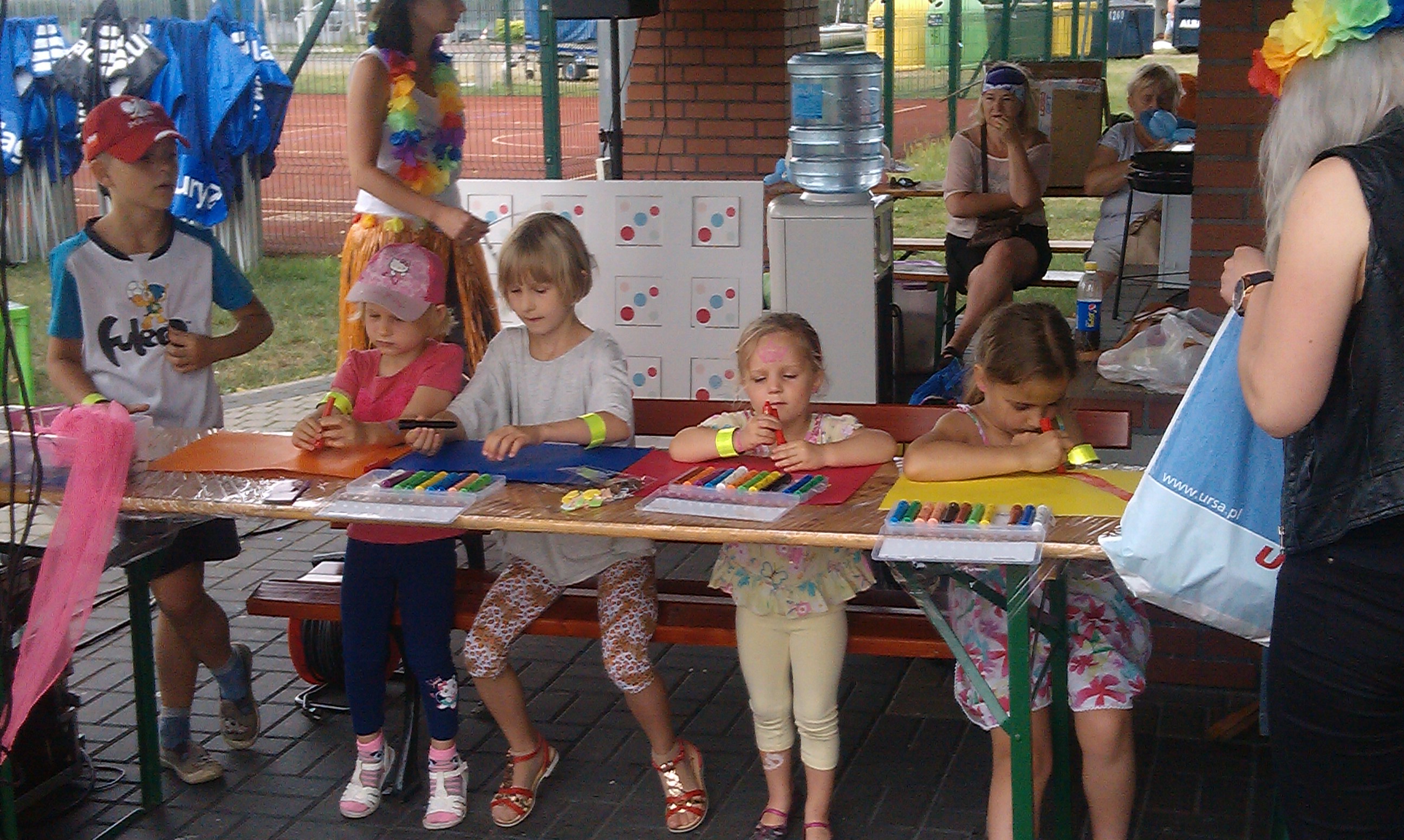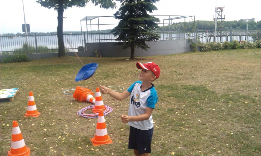 Porywisty wiatr przeszkadzał w przeprowadzeniu warsztatów, jednak i tak powstało kilka pięknych rysunków, których główną tematyką były „moje wymarzone wakacje”. Tuż po malowaniu przyszła pora na zawody w rzucaniu workiem do celu. Jego zwycięzcą został Olek – co nie było zaskoczeniem, gdyż przed rozpoczęciem zabawy bardzo długo ćwiczył. Kolejną konkurencją było jak najdłuższe kręcenie hula-hop, a następnie wyścig w workach. Nagrodą dla wygranych, jak i pocieszeniem dla przegranych było samodzielne puszczanie ogromnych baniek, które co przystanek robią furorę i sprawiają dzieciom dużo radości. Najmłodsi plażowicze zdawali się nie zwracać uwagi na przelotny deszcz, w trakcie ćwiczeń równowagi i konkursie w zapamiętywanie obrazków na specjalnej tablicy.