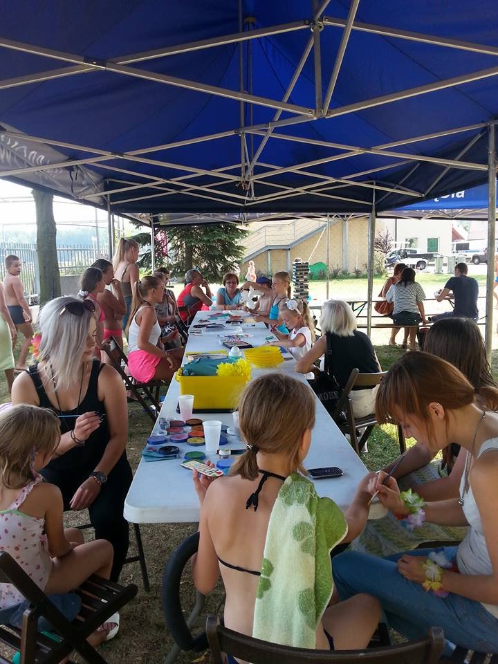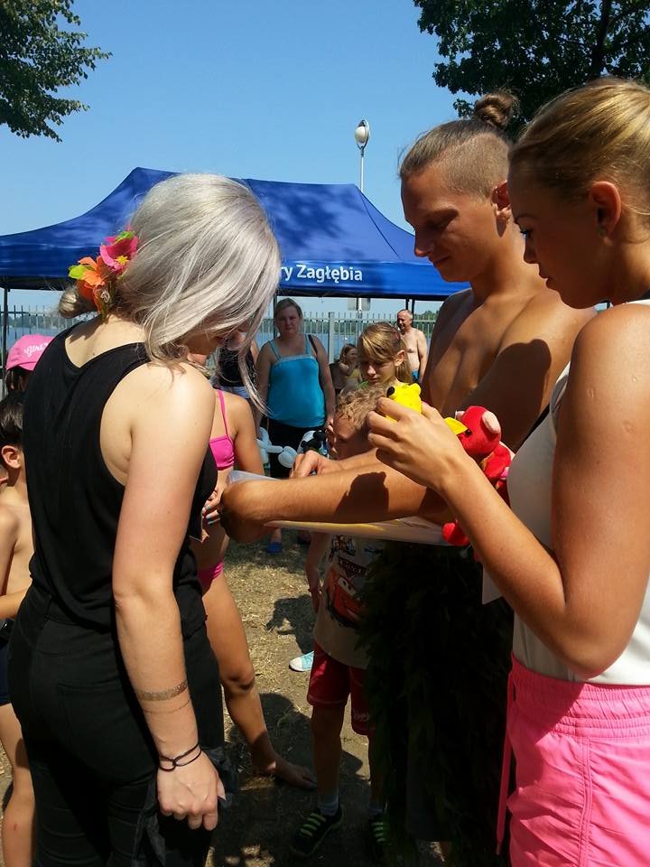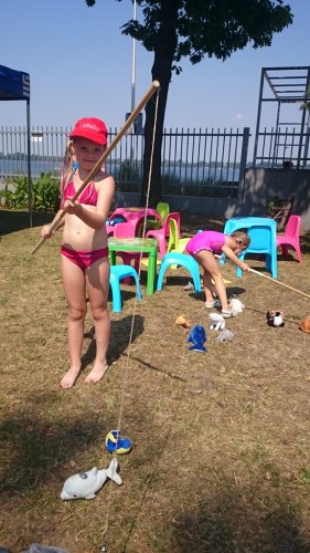 To już szósty Przystanek Plaża. Jak przystało na sierpień – pogoda iście wakacyjna. Dla dzieci wypoczywających z rodzicami nad jeziorem Pogoria III przygotowaliśmy wiele atrakcji. Leżakowanie na piasku szybko przegrało w konfrontacji z naszymi zabawami. Tor przeszkód, rzut do celu, malowanie drewienek, zwierzątka i miecze z balonów, a także wielkoformatowe Domino i Jenga - to wszystko nie pozwalało dzieciom na nudę. Uczestnicy Przystanku chodzili z dumnie wyprostowaną piersią, aby jak najlepiej zaprezentować swoje imponujące tatuaże. Wśród wielu wzorów znalazły się kwiatki, gwiazdki, serduszka, pająki, a nawet wąż i przykuwający uwagę smok. A ponieważ jesteśmy nad jeziorem, to i wędkowania nie zabrakło. Specjalnie przygotowane do tego celu wędki i pluszowe ryby oraz inne morskie stworzenia nie miały chwili wytchnienia. Choć przynętą był tylko magnes, to zawodników w konkurencji łowienia ryb na czas śmiało można określić mianem wędkarzy. Na najszybszych i najsprytniejszych czekały nagrody.