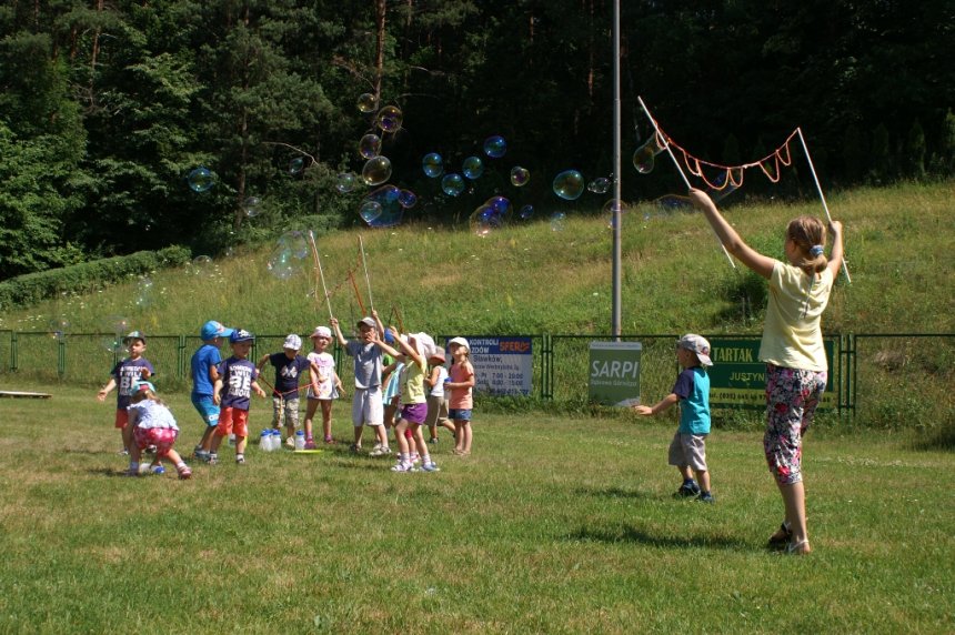 Jaka to melodia? A właściwie jaka to bajka? Ten konkurs zawsze robi furorę. Dzieci dzielnie odgadywały piosenki z kreskówek chociaż nie zawsze było to łatwe zadanie. Najmłodsi uczestnicy Przystanku Wakacje z chęcią ozdobili drzewa obwinięte streczem. Chyba nigdy wcześniej te drzewa nie były tak kolorowe. Bardzo dużo energii wykrzesali z siebie zawodnicy rywalizujący w torze przeszkód na czas. Nie zabrakło także ochotników do nauki kręcenia talerzykiem i kolorowymi poikami. Jedną z największych atrakcji był jednak jak zawsze pokaz olbrzymich baniek mydlanych.