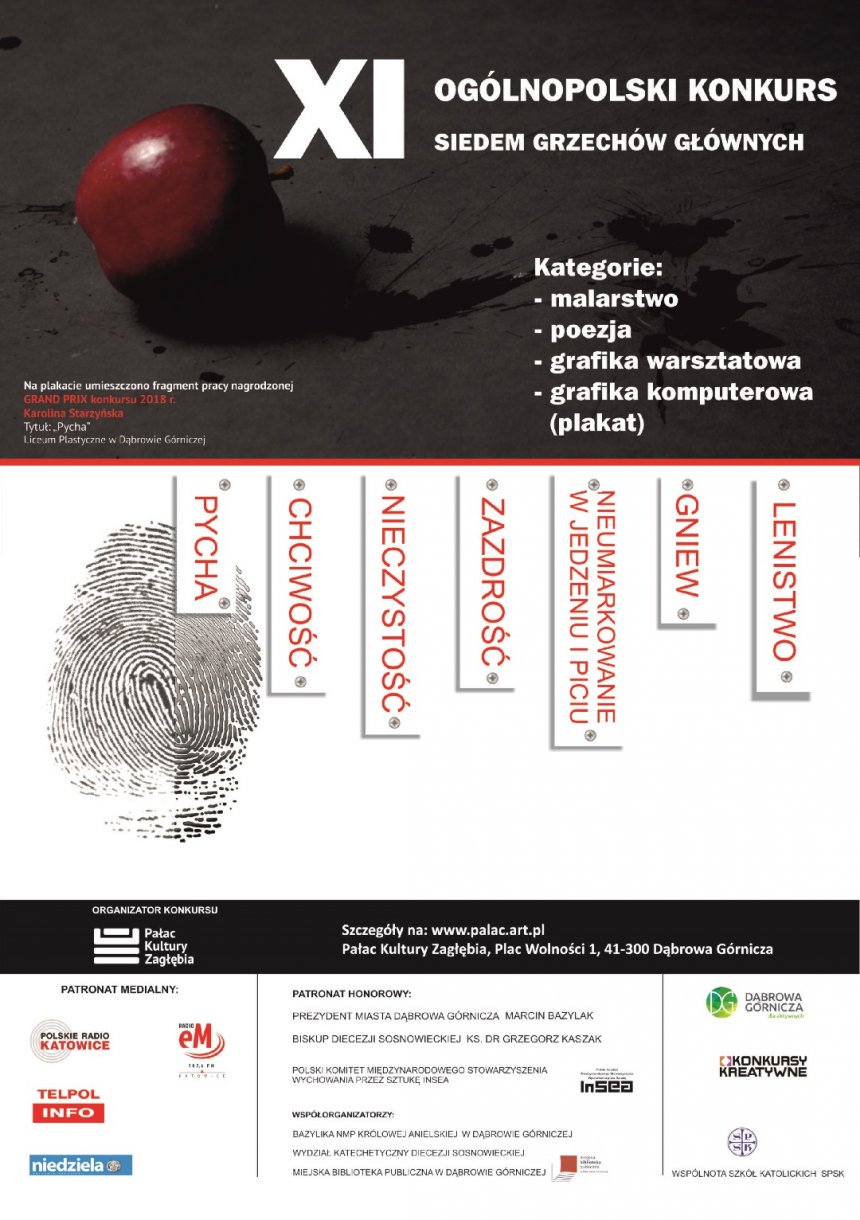 Rok 2019 otwiera drugą dekadę Ogólnopolskiego Konkursu Siedem Grzechów Głównych. Dziesięcioletnia obecności inicjatywy na mapie wydarzeń artystycznych naszego kraju zaowocowała odkryciem wielu talentów plastycznych i poetyckich. Owoce konkursu prezentowaliśmy szerszej publiczności poprzez m.in.: organizację wystaw czy audycji na antenie stacji radiowych i w lokalnej telewizji, potwierdzając wysoką wrażliwość i niewątpliwy talent autorów. Wydarzenia te, jak również płynące z zewnątrz słowa zachęty, skłoniły nas do kontynuacji podjętego niegdyś zadania i ogłoszenia XI edycji konkursu.
