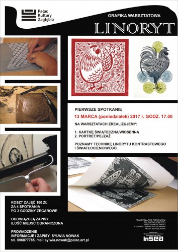 Na zajęciach wykonamy kartkę świąteczną lub wiosenną, którą będzie można wielokrotnie odbić i wysłać swoim najbliższym. Drugim tematem będzie portret lub pejzaż - w tym ćwiczeniu zwiększymy format i inspirując się ulubionym zdjęciem, wydrukiem lub własnym projektem wykonamy matrycę i odbitki. Poznamy różnicę pomiędzy linorytem kontrastowym, światłocieniowym, jednokolorowym, wielobarwnym. Start już 13 marca 2017 r. (poniedziałek), koszt 100 zł (4 spotkania po 3 godziny zegarowe).