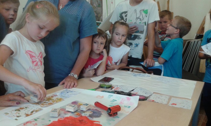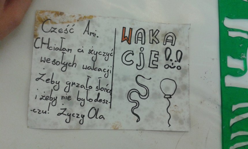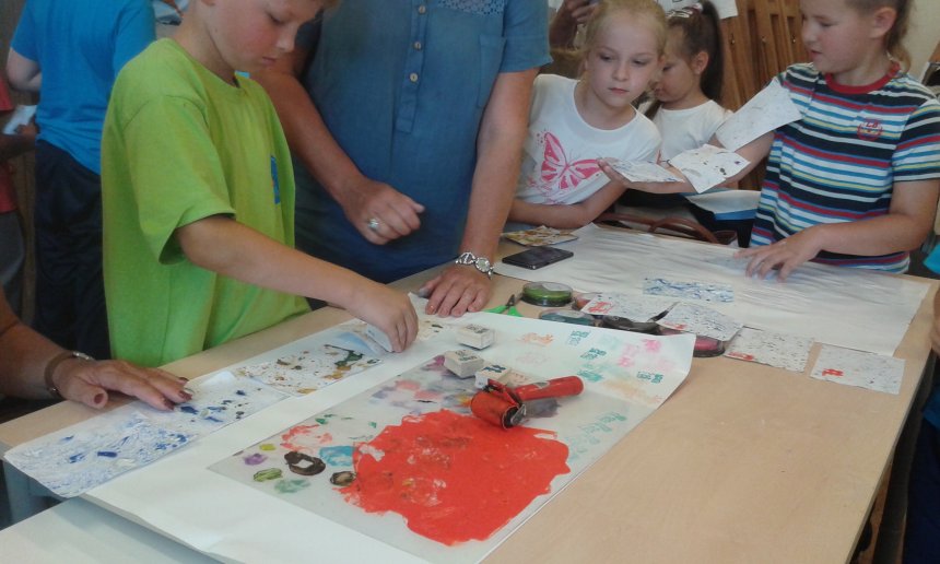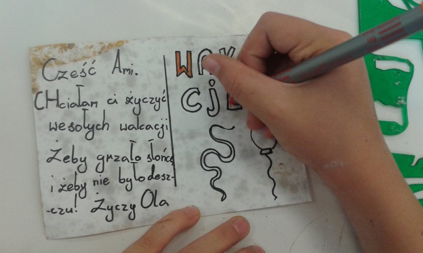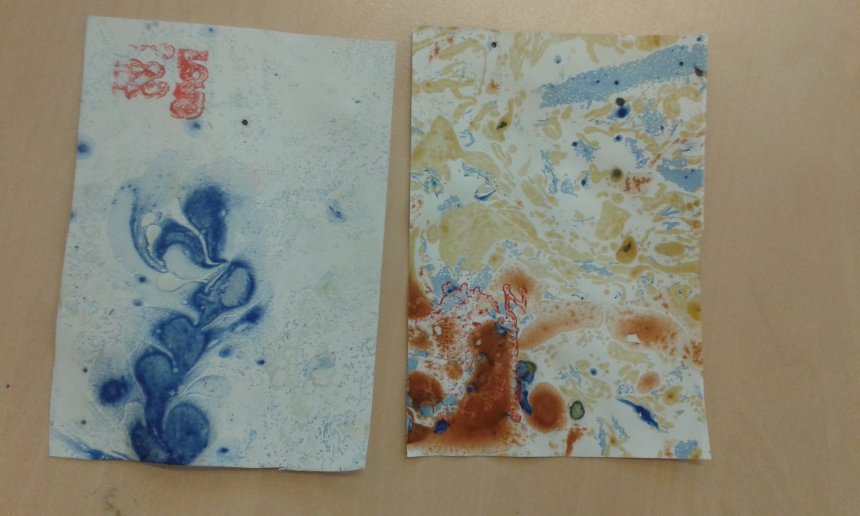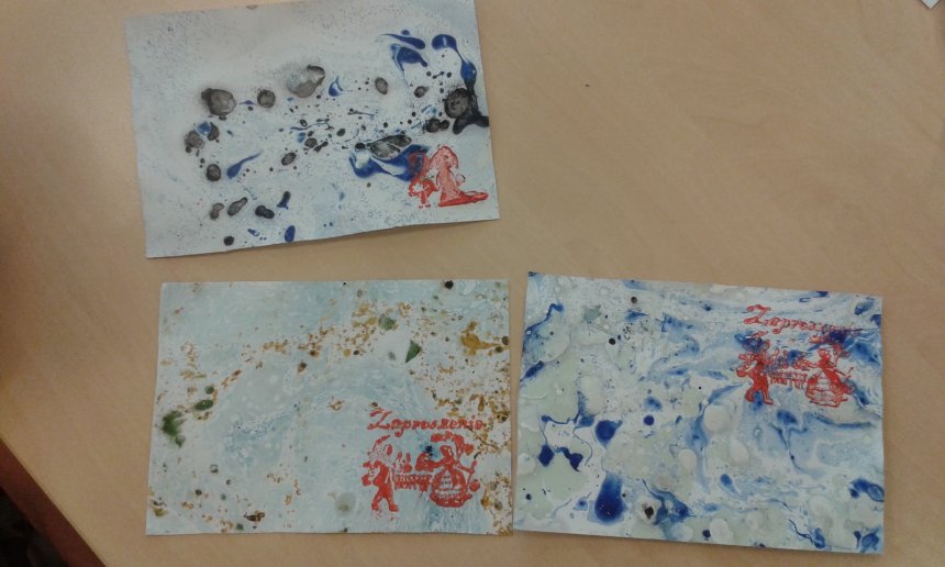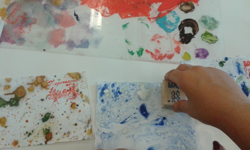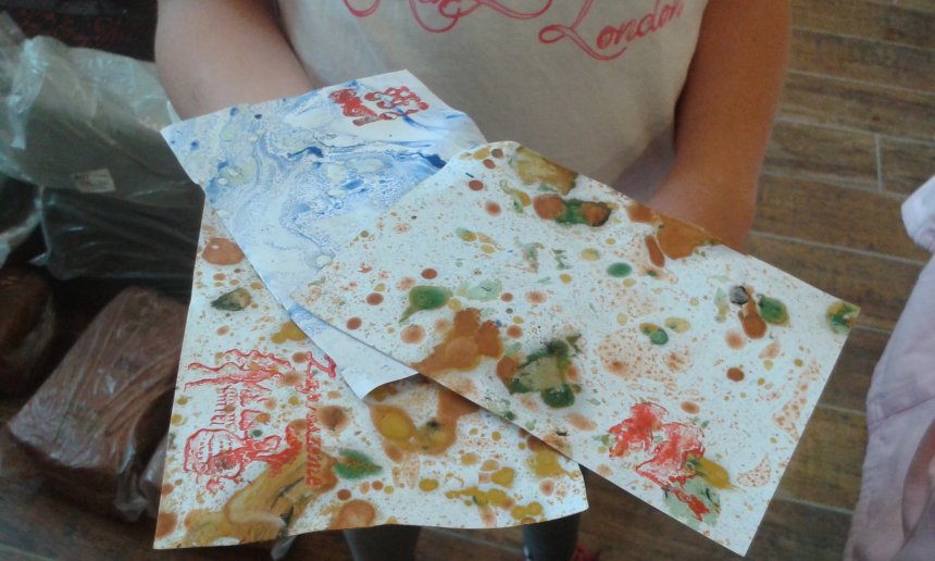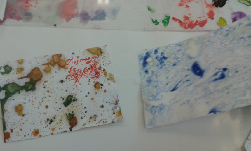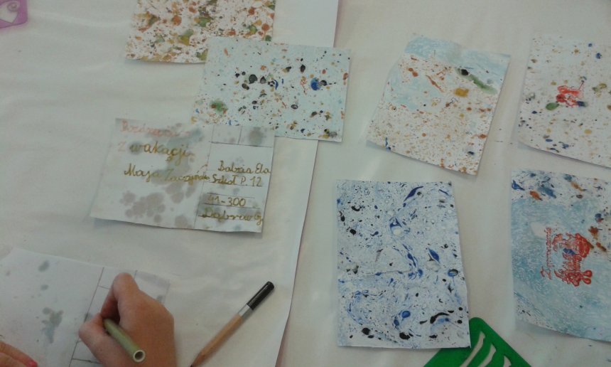 Dzieci z  dąbrowskiego Sztowarzyszenia "Dar Serca" spróbowały tej sztuki na warsztatach w pracowni plastycznej. Barwiony papier wykorzystaliśmy do wykonania pocztówki z wakacji, ozdobnych zaproszeń i kart okolicznościowych. Przy tej okazji przypomnieliśmy sobie jak pisze się życzenia, adresuje i wysyła korespondencję papierową.