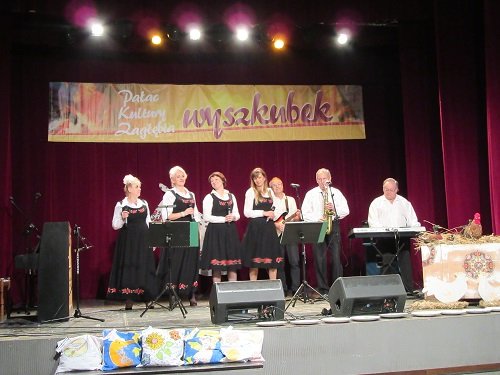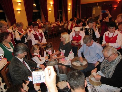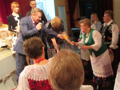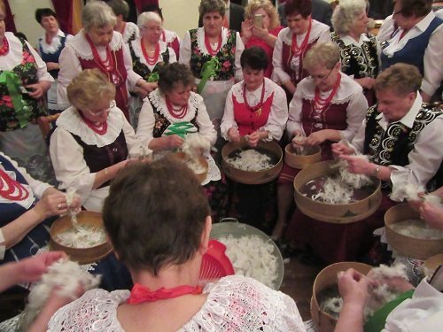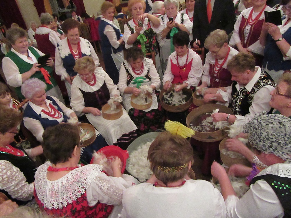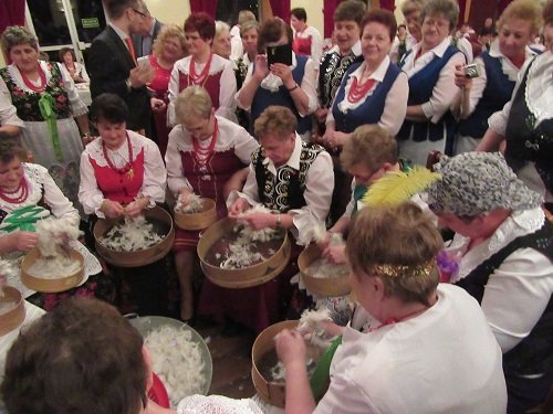 Żeby stracić trochę kalorii panie stanęły do konkurencji skubania pierza. Sala na chwilę zmieniła się we wnętrze wiejskiej chałupy. W powietrzu wirował biały puch i duch zdrowej rywalizacji. Niezwyciężoną „skubaczką” pierza została reprezentantka KGW Łęka, a z zaproszonych gości mistrzem wyskubku został pan Edward Bober. Serdecznie gratulujemy.