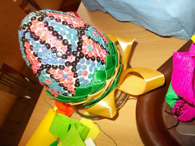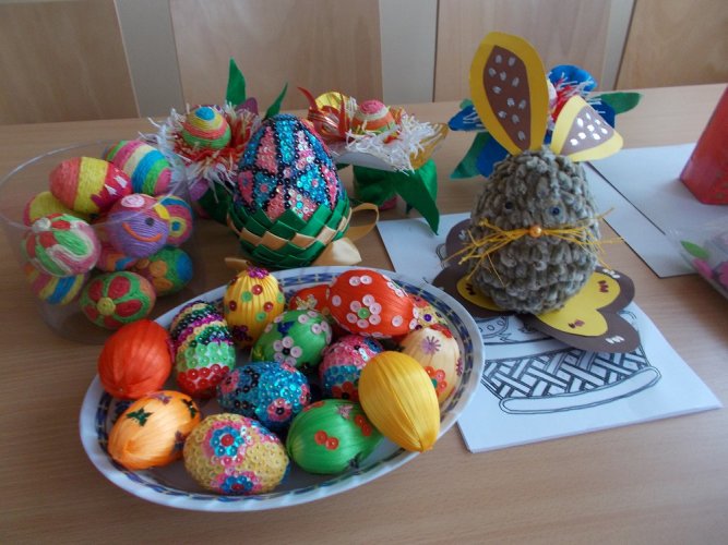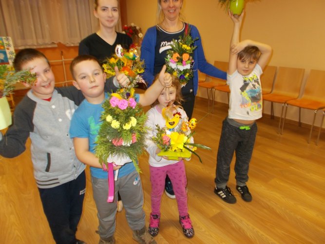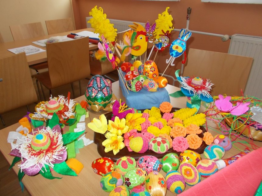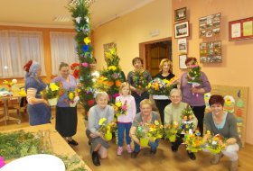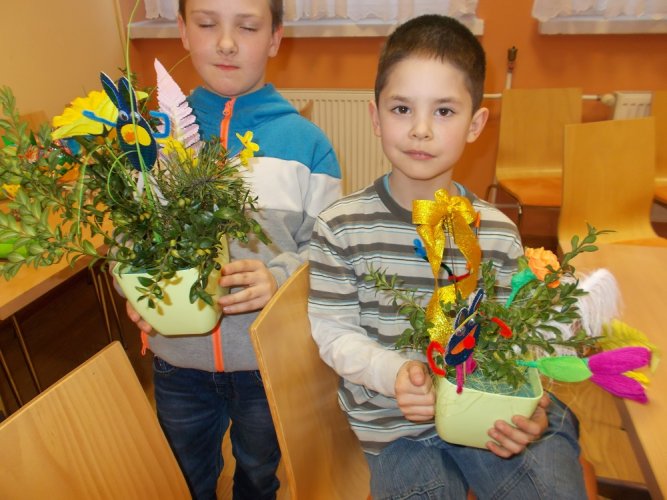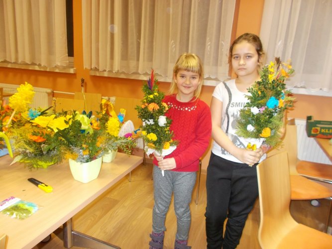 Powstały kwiatowe arcydzieła (stroiki, palmy i różne ozdoby). Była to okazja do stworzenia oryginalnych pisanek w atmosferze zabawy i szaleństwa. Dzieci wykorzystały takie elementy jak kolorowe piórka, wstążki, cekiny i stworzyły przeróżne kompozycje kwiatowe tym samym nawiązując do nadchodzącej wiosny.