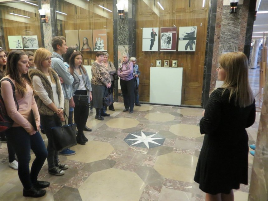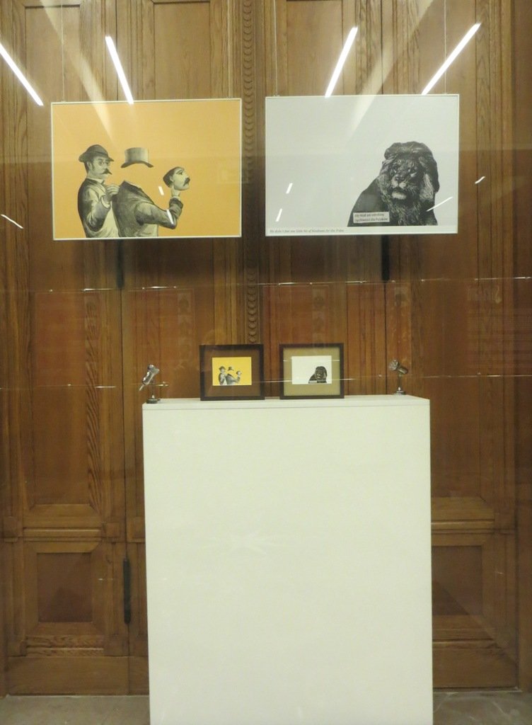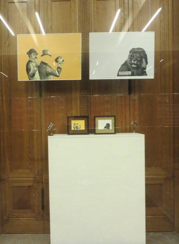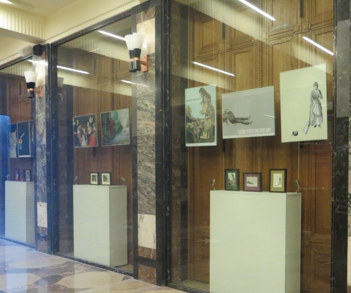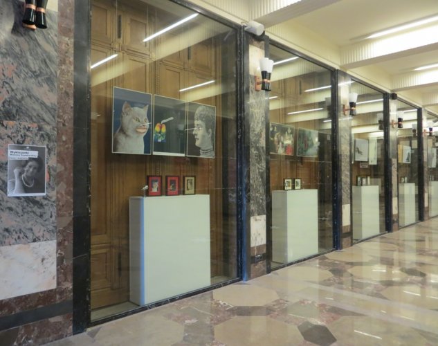 Wystawę "Wyklejanki Wisławy Szymborskiej" można oglądać w przeszklonych przestrzeniach przyscenicznych w holu głównym Pałacu Kultury Zagłębia, przy sali widowiskowej.