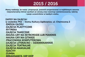 Serdecznie zapraszamy wszystkich zainteresowanych ofertą zajęć w sezonie 2015/2016 na Dzień Otwarty w Domu Kultury Ząbkowice. Będzie to wyjątkowa okazja do zapoznania się z propozycją zajęć w nadchodzącym roku kulturalno-oświatowym, a także do porozmawiania z instruktorami.