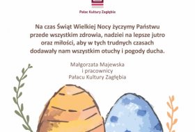 Na czas Świąt Wielkiej Nocy życzymy Państwu przede wszystkim zdrowia, nadziei na lepsze jutro oraz miłości, aby w tych trudnych czasach dodawały nam wszystkim otuchy i pogody ducha. Małgorzata Majewska i pracownicy Pałacu Kultury Zagłębia