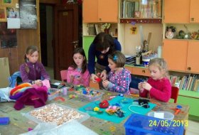 Dzieciaki poznawały różnorodne techniki plastyczne, próbowały swoich sił w ceramice, malowaniu akwarelą, a także - wspólnie z mamami z okazji ich święta - malowaniu na tkaninach. Młodzi artyści dyskutowali na temat tego, czym jest plama, "odkrywali" malowidła prehistoryczne w grocie Lascaux, wykonywali portrety oraz przedstawiali świat istniejący w nieograniczonej, dziecięcej wyobraźni. Swoimi pracami obdarowywali najbliższych, wykonując własnoręcz
