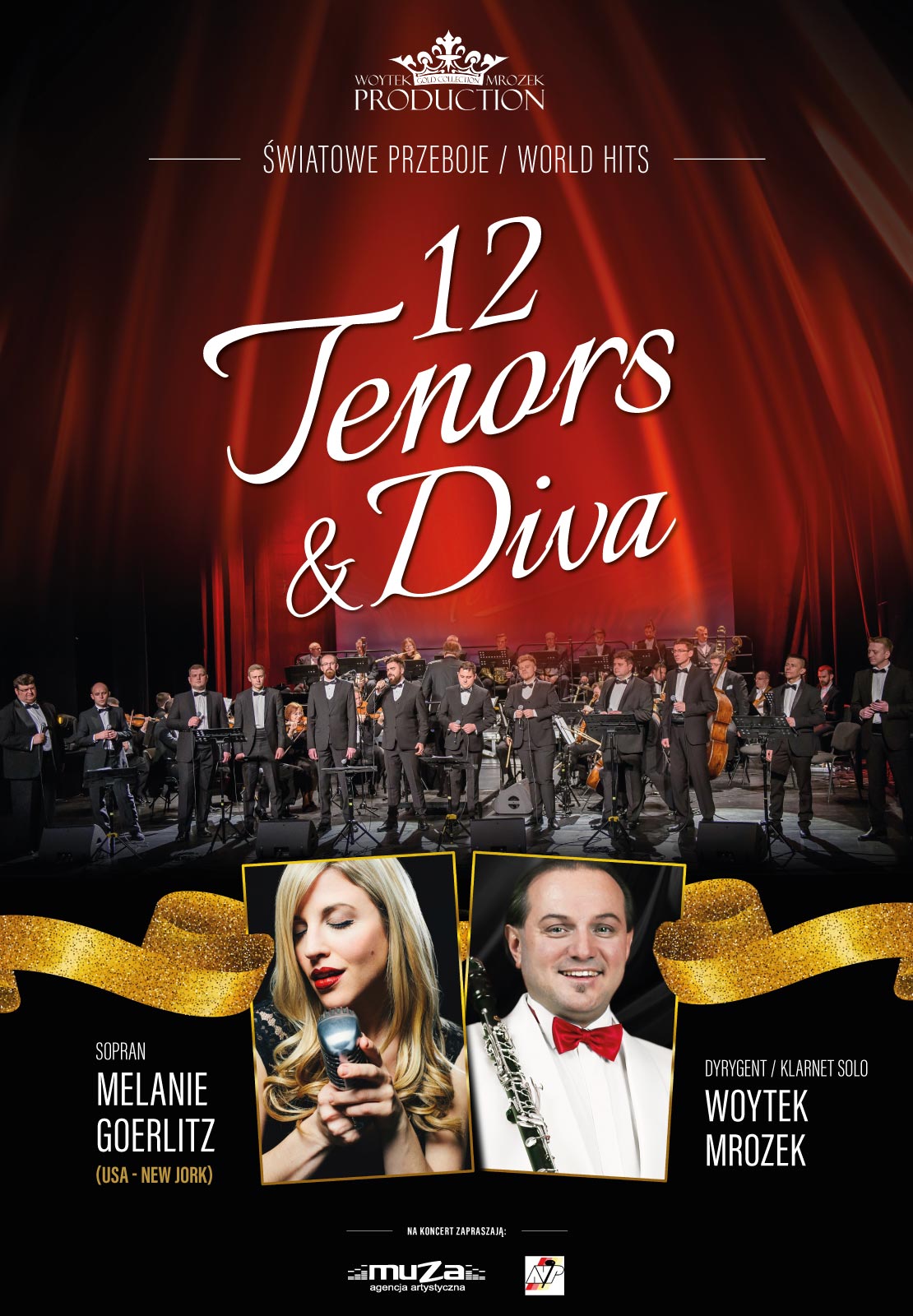 Solistom towarzyszy światowej klasy Narodowa Orkiestra Symfoniczna Filharmonii Lwowskiej INSO, która koncertuje każdego roku w największych salach koncertowych Europy, m.in. w Berlinie, Zurychu, Monachium, Concertgebouw w Amsterdamie. Charakterystycznym dla koncertów 12 Tenors & Diva jest wirtuozeria wokalu, kolor wielogłosowości połączony z humorem, dzięki czemu burzą oni stereotypowy obraz klasycznej muzyki wokalnej i instrumentalnej. W ten magiczny wieczór usłyszymy najsłynniejsze i najpiękniejsze fragmenty operetek, oper, musicali oraz aranżacje utworów współczesnych, rockowych i pop kultury takich jak ponadczasowa Granada Austina Lary czy też hit Jana Kiepury Brunetki Blondynki, oklaskiwany na całym świecie przebój grupy Il Divo Unbrake My Heart czy też We Will Rock You zespołu Queen, przeboje grupy ABBA: Mamma Mia, Dancing Queen oraz ponadczasowe hity Whitney Houston - All at once czy I wanna dance with someboby, Hallo - Beyonce czy duet Shallow z Bradlayem Cooperem i Lady Gagą z filmu Narodziny Gwiazdy nagrodzony Grammy w 2018 r. i wiele innych muzycznych niespodzianek.