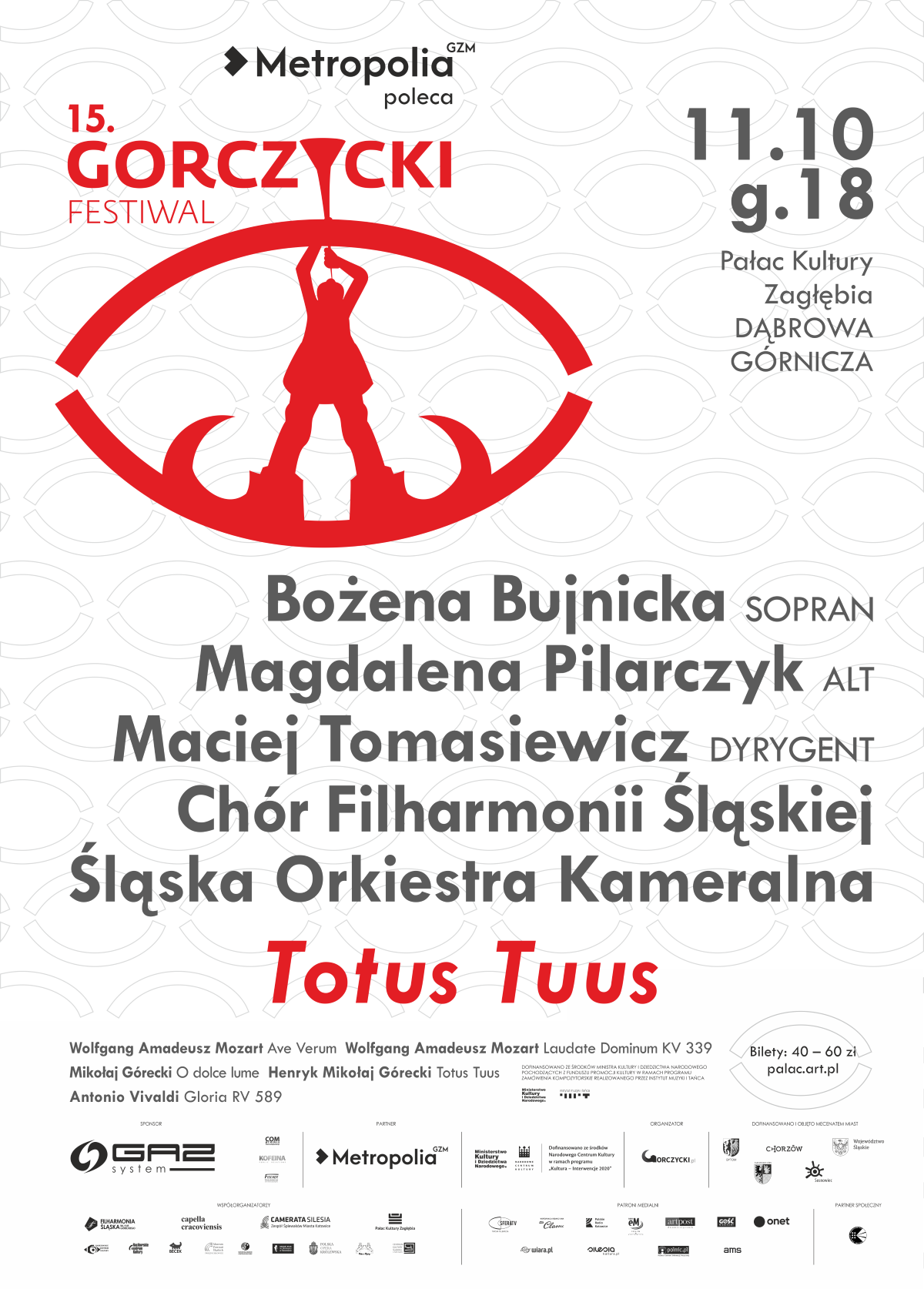 Koncert poświęcony Janowi Pawłowi II Totus Tuus zakończy 15. Międzynarodowy Festiwal im. G.G. Gorczyckiego - 11 października o 18:00 w Pałacu Kultury Zagłębia. Na program koncertu, podsumowującego wydarzenie poświęcone między innymi obchodom 100. rocznicy urodzin Jana Pawła II, złożą się wspaniałe dzieła Wolfganga Amadeusza Mozarta i Antonia Vivaldiego oraz Totus Tuus Henryka Mikołaja Góreckiego i prawykonanie utworu O dolce lume na sopran solo, chór mieszany i orkiestrę smyczkową Mikołaja Góreckiego.