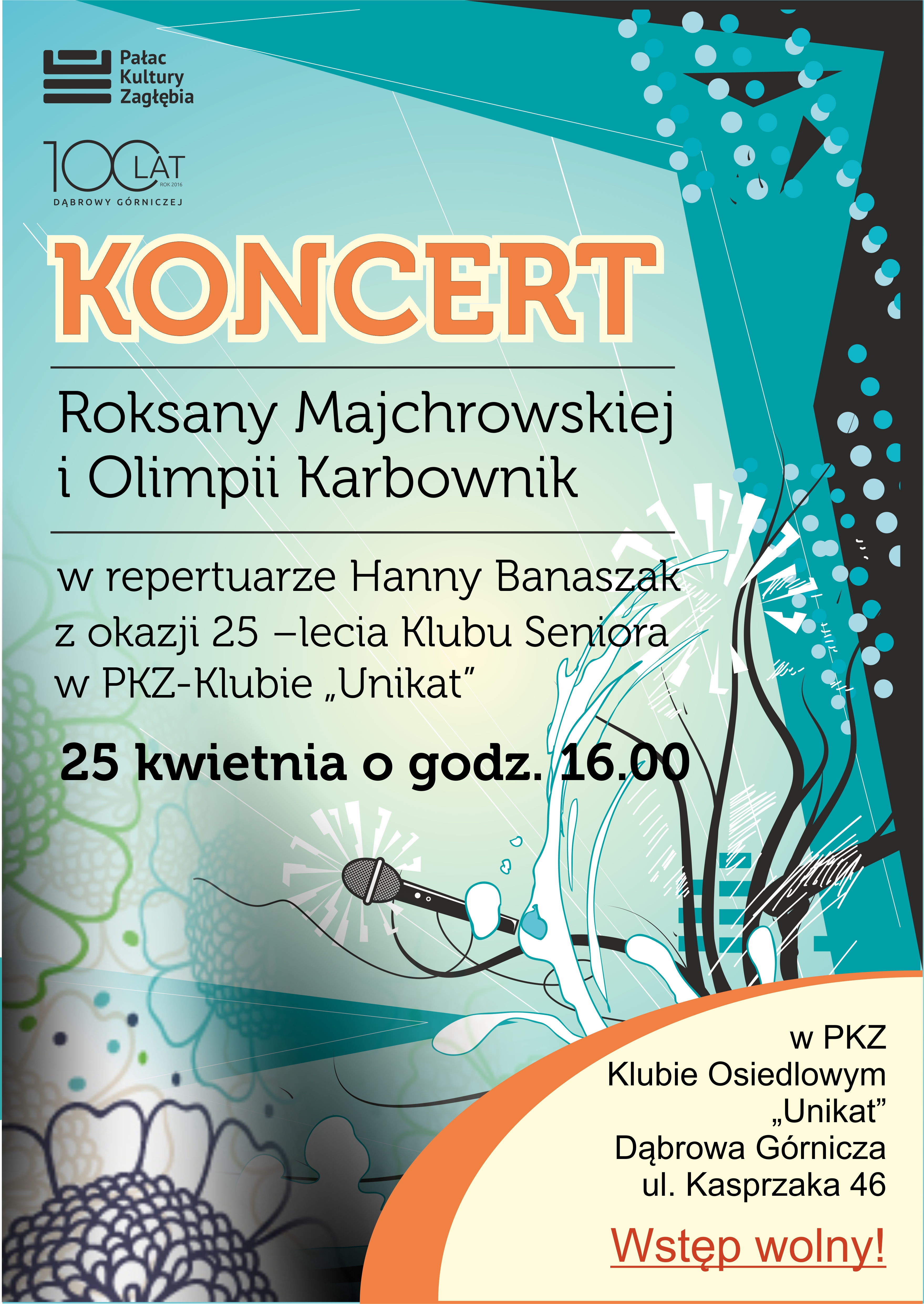 16.00 ( w klubie) koncert sopranistek Roksany Majchrowskiej i Olimpii Karbownik w repertuarze Hanny Banaszak, z towarzyszeniem zespołu w składzie: