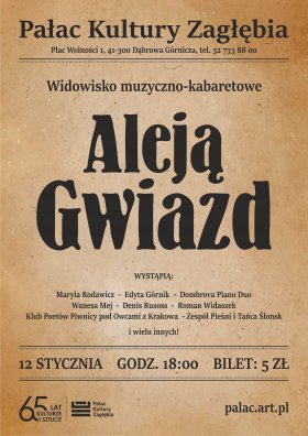 12 stycznia o 18:00 zapraszamy mieszkańców na nieziemskie widowisko muzyczno-kabaretowe pn. Aleją Gwiazd, które odbędzie się w Sali Teatralnej Pałacu Kultury Zagłębia z okazji jubileuszu 65-lecia pałacu!