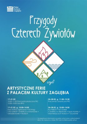 Serdecznie zapraszamy na Artystyczne ferie z PKZ pod hasłem Przygody Czterech Żywiołów w Świetlicy w Antoniowie. Zajęcia będą odbywały się w terminie 17 - 21 lutego 2025 w godzinach 10.00-14.00. W programie warsztaty artystyczne z zakresu plastyki, rękodzieła, tańca, teatru oraz wyjścia o charakterze kulturalnym. Liczba miejsc ograniczona. Szczegóły w placówce oraz pod numerem telefonu 32 733 87 80.