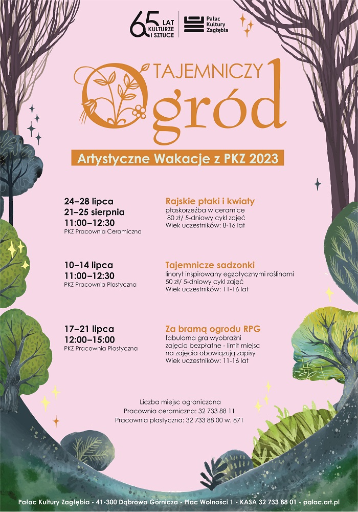 Serdecznie zapraszamy na Artystyczne Wakacje z PKZ pod hasłem Tajemniczy ogród w Pracowni Plastycznej. Zajęcia będą odbywały się w terminie 10-14 lipca w godzinach 11.00-12.30. W programie warsztaty artystyczne Tajemnicze sadzonki - linoryt inspirowany egzotycznymi roślinami. Liczba miejsc ograniczona. Szczegóły w Pracowni Plastycznej oraz pod numerem telefonu 32 733 88 00 w. 871.