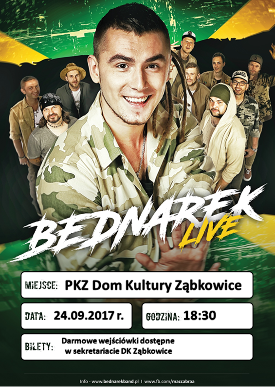 24 września o godzinie 18:30 sceną Domu Kultury Ząbkowice zawładną jamajskie rytmy w wykonaniu Kamila Bednarka wraz z zespołem! Wszystkim znany Bednarek wykona głównie utwory ze swojego ostatniego krążka zatytułowanego Oddycham. Koncert odbędzie się w ramach Dąbrowskiego Budżetu Partycypacyjnego, a co za tym idzie bilety na koncert będą darmowe i wkrótce dostępne w sekretariacie Domu Kultury Ząbkowice.