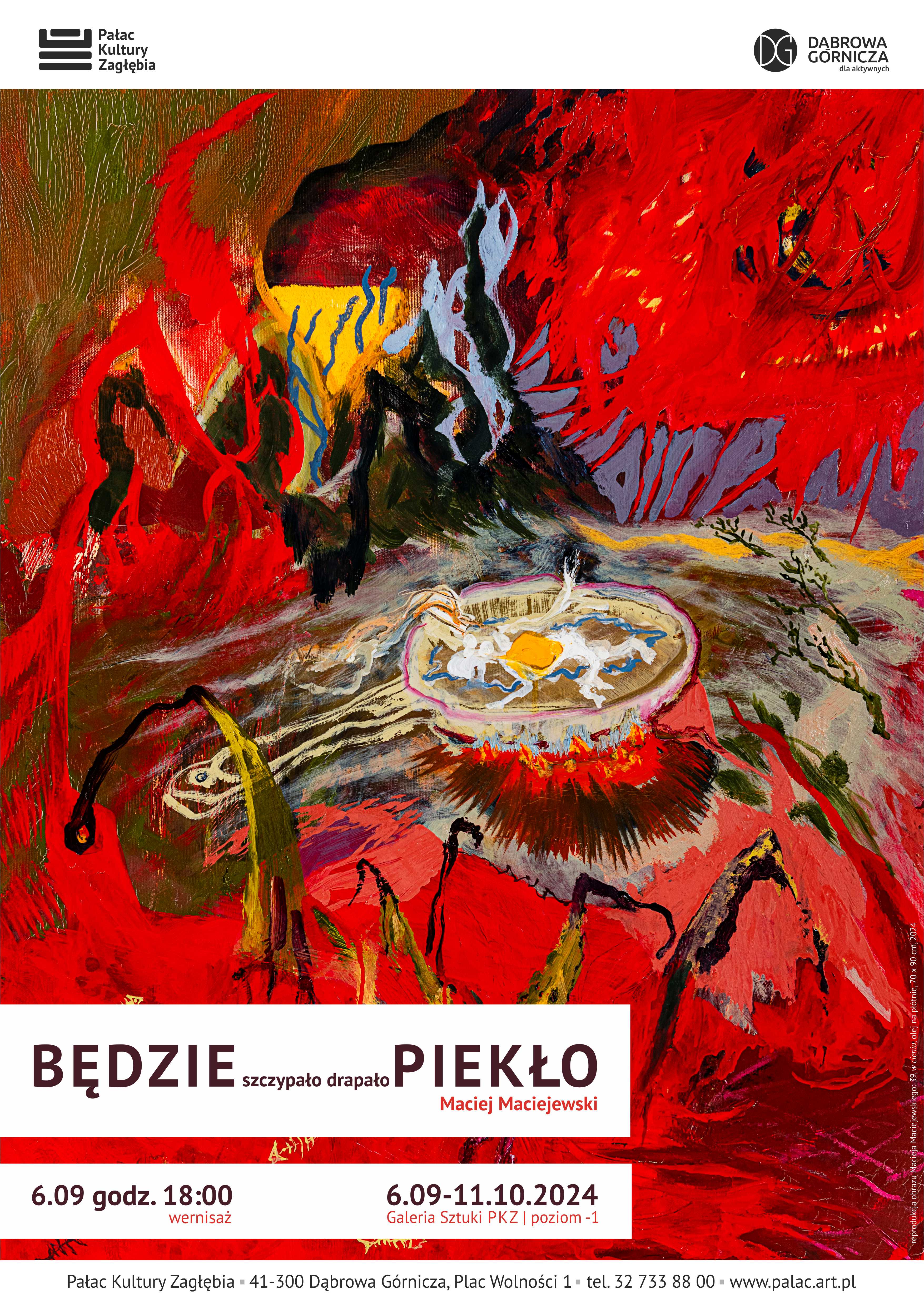 6 września o 18:00 zapraszamy do Galerii Sztuki Pałacu Kultury Zagłębia na wernisaż wystawy BĘDZIE szczypało drapało PIEKŁO, autorstwa Macieja Maciejewskiego, który w swoich pracach sięga do czystego ekspresjonizmu malarskiego. Ekspozycja będzie dostępna dla zwiedzających od 6 września do 11 października, w godzinach otwarcia pałacowej Galerii.