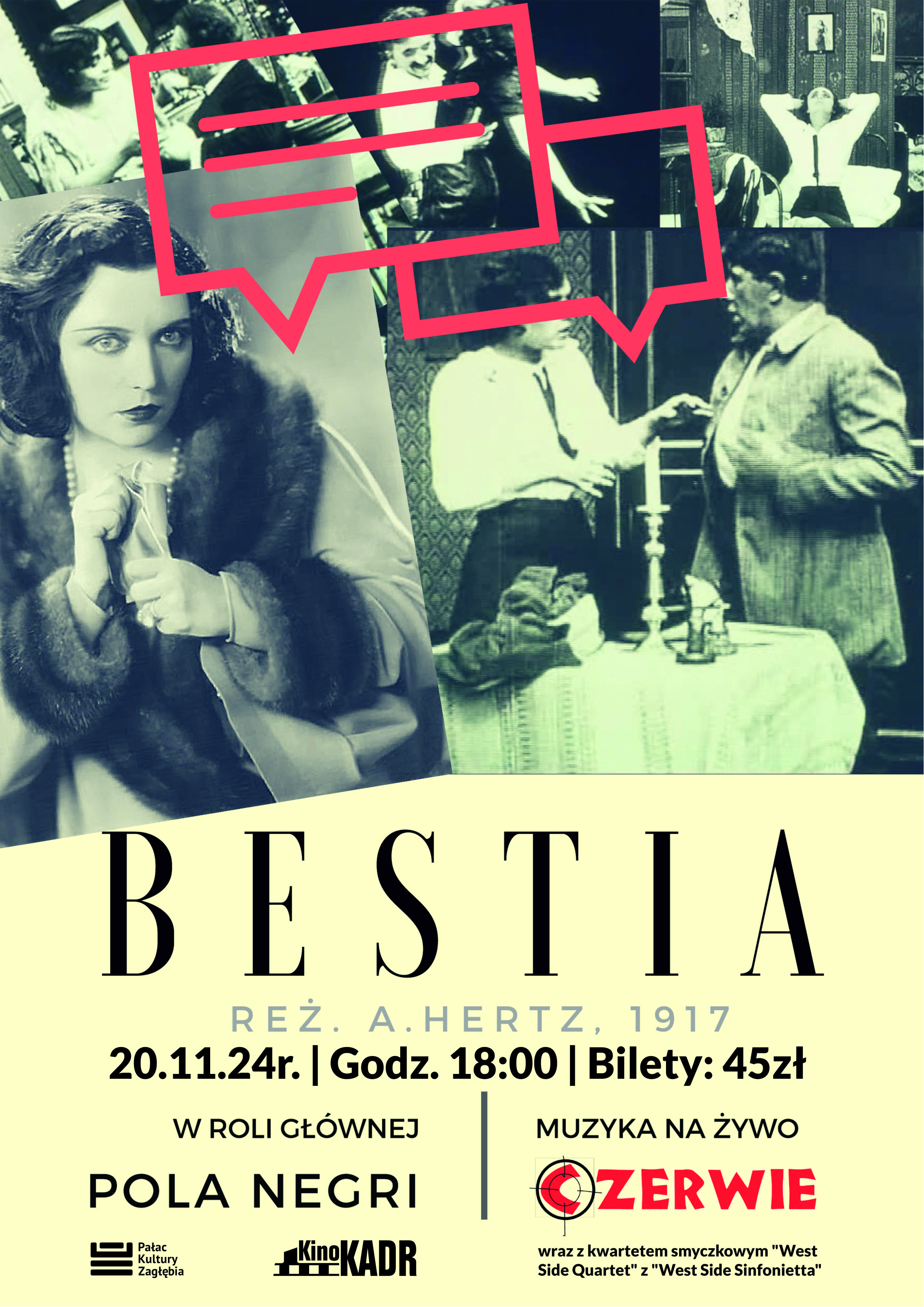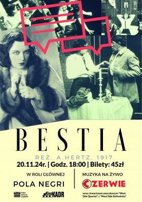 To będzie wyjątkowe filmowo-muzyczne wydarzenie. Zespół Czerwie wystąpi z wyjątkową aranżacją do niemego filmu "Bestia" wraz z kwartetem smyczkowym "West Side Quartet" z "West Side Sinfonietta". Wydarzenie odbywa się w ramach cyklu Sztuka na ekranie oraz projektu Pałac ma głos, dofinansowanego ze środków KPO.