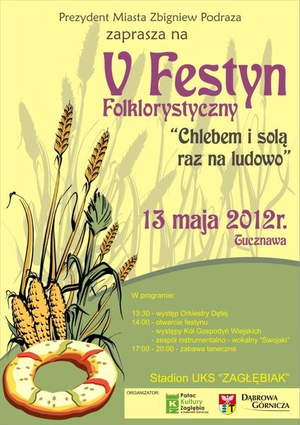 W dniu 23.05.2012 r. ok. godziny 13.00 na boisku Klubu Sportowego „Zagłębiak" w Tucznawie odbędzie się cykliczny V Festyn Folklorystyczny „Chlebem i solą - raz na ludowo" pod patronatem Prezydenta Miasta Zbigniewa Podrazy. Jak co roku festyn jest organizowany przez Urząd Miejski i Pałac Kultury Zagłębia w DG. Ideą tej imprezy jest prezentacja poszczególnych Kół Gospodyń Wiejskich z dwunastu dzielnic miasta - tzw. terenów zielonych. Członkinie z Kół Gospodyń Wiejskich ubrane w różnobarwne stroje ludowe (każde koło jest w innych strojach, innej kolorystyce) prezentuje na scenie ulubione pieśni ze swojego repertuaru a całość rozpoczyna się wspólnym wykonaniem Hymnu Gospodyń. Ponadto każde Koło przygotowuje pięknie ozdobiony stół z regionalnymi specjałami i wzorem staropolskiej gościnności, zapraszając na degustację wszystkich odwiedzających mieszkańców, w tym gości honorowych.
