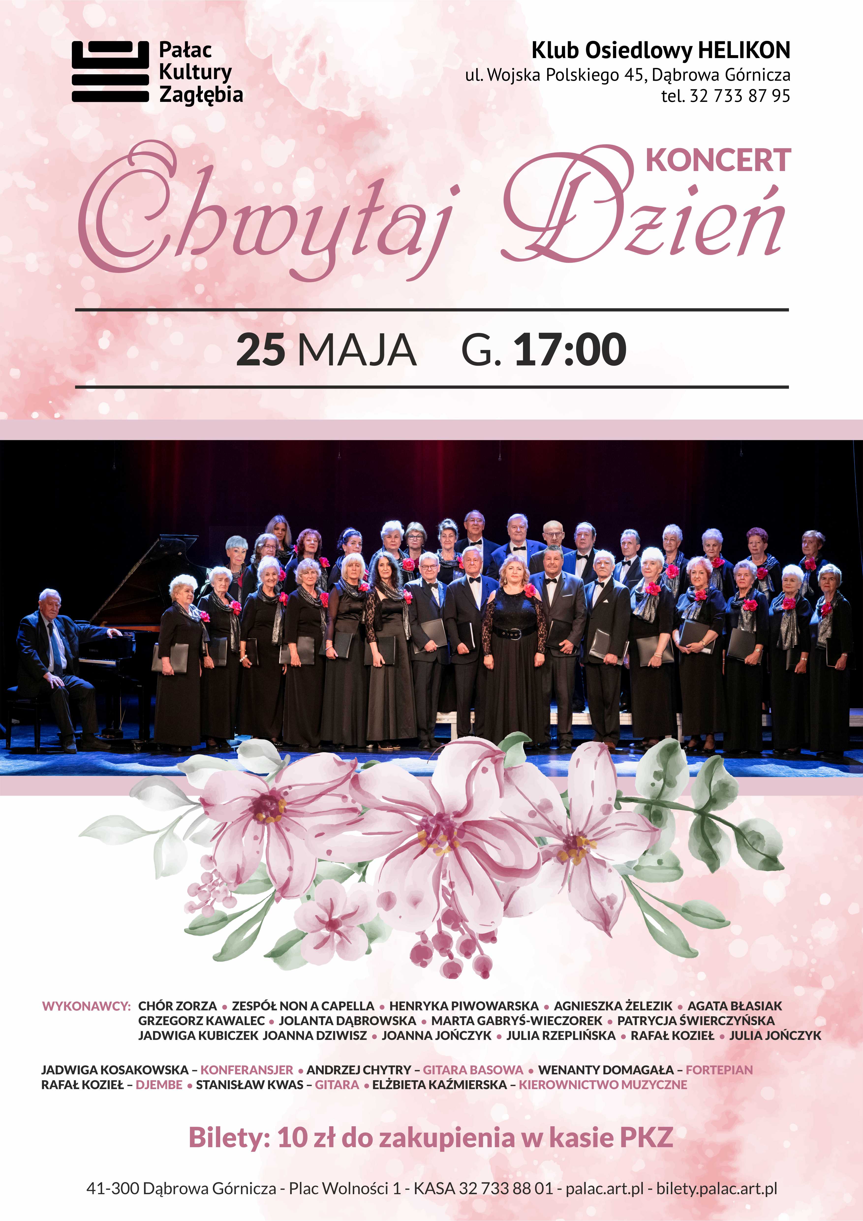 25 maja o 17:00 zapraszamy do Klubu Osiedlowego Helikon na koncert, pt. "Chwytaj Dzień", w wykonaniu Chóru Zorza, zespołu Non a capella oraz solistów i instrumentalistów na co dzień związanych z klubem.