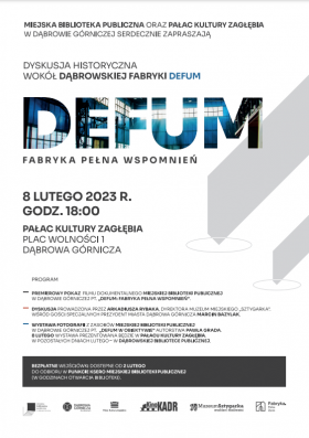 Wydarzenie poświęcone dąbrowskiej fabryce DEFUM ujętej w kilku perspektywach. Premierowy pokaz filmu dokumentalnego Miejskiej Biblioteki Publicznej w Dąbrowie Górniczej pt. „DEFUM: fabryka pełna wspomnień”. Film opowiada o historii fabryki DEFUM widzianej oczami ówczesnych pracowników, a także o nowych możliwościach, jakie daje industrialna przestrzeń w centrum miasta.